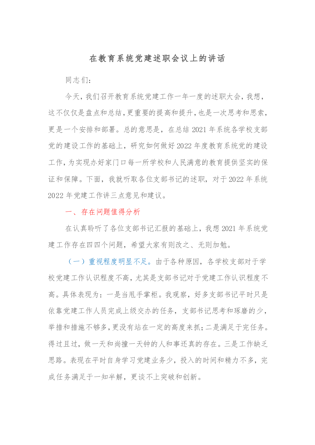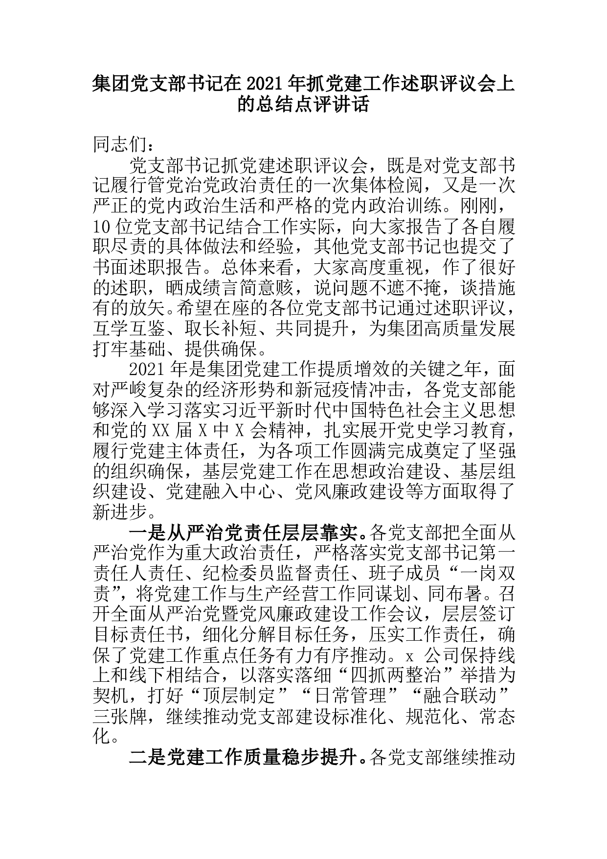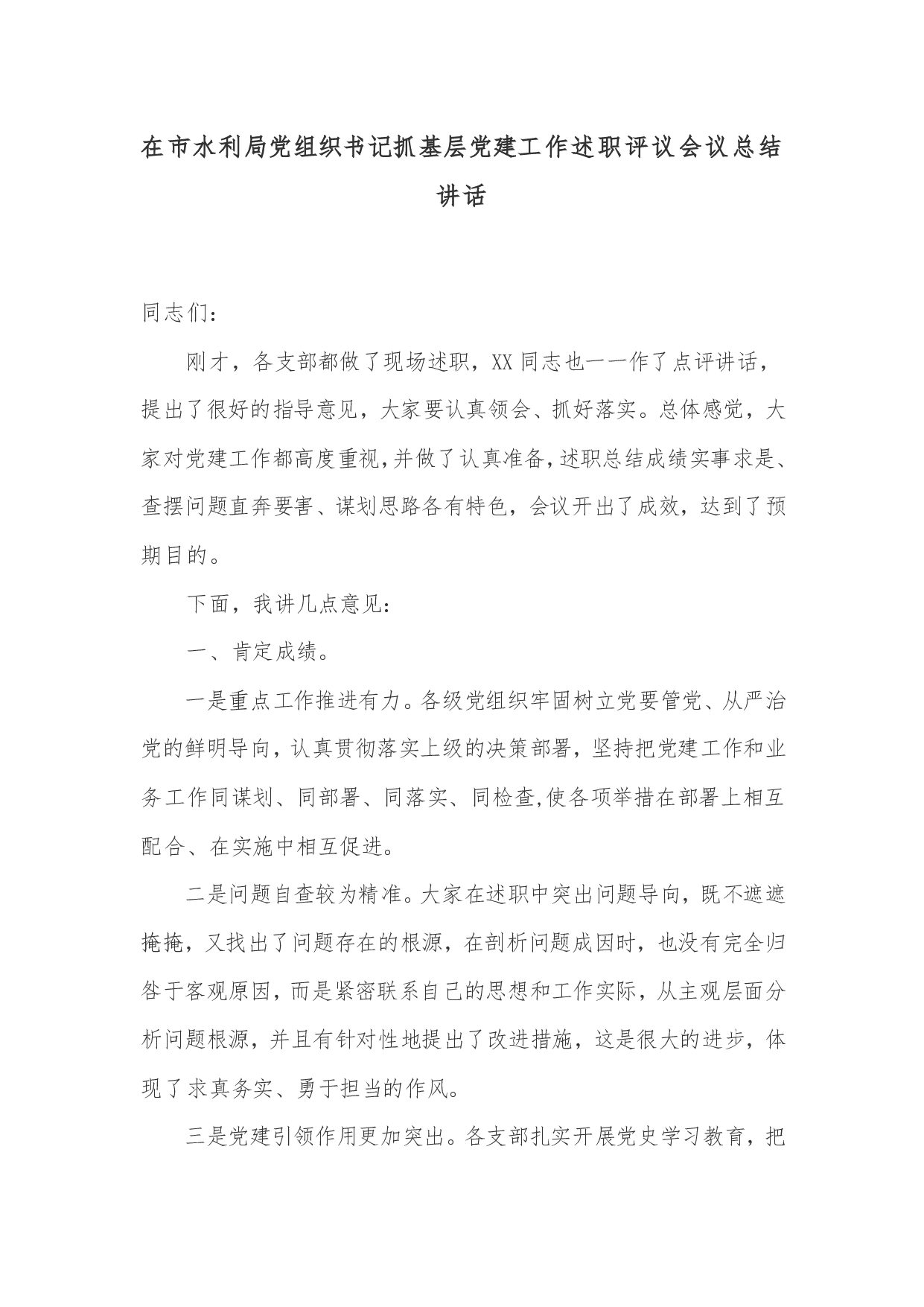 在市水利局党组织书记抓基层党建工作述职评议会议总结讲话同志们:刚才,各支部都做了现场述职,XX同志也一一作了点评讲话,提出了很好的指导意见,大家要认真领会、抓好落实。总体感觉,大家对党建工作都高度重视,并做了认真准备,述职总结成绩实事求是、查摆问题直奔要害、谋划思路各有特色,会议开出了成效,达到了预期目的。下面,我讲几点意见:一、肯定成绩。一是重点工作推进有力。各级党组织牢固树立党要管党、从严治党的鲜明导向,认真贯彻落实上级的决策部署,坚持把党建工作和业务工作同谋划、同部署、同落实、同检查,使各项举措在部署上相互配合、在实施中相互促进。二是问题自查较为精准。大家在述职中突出问题导向,既不遮遮掩...