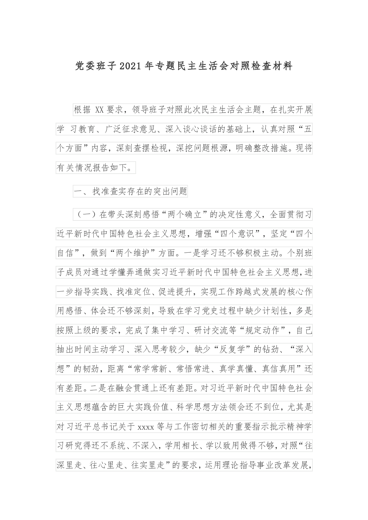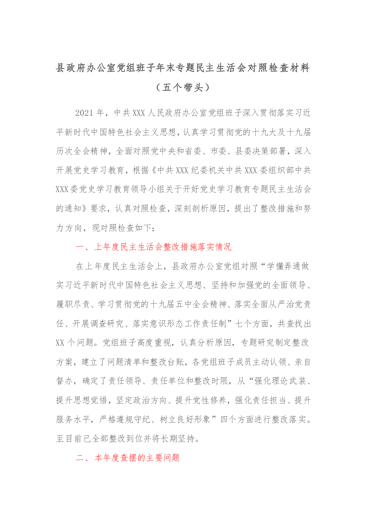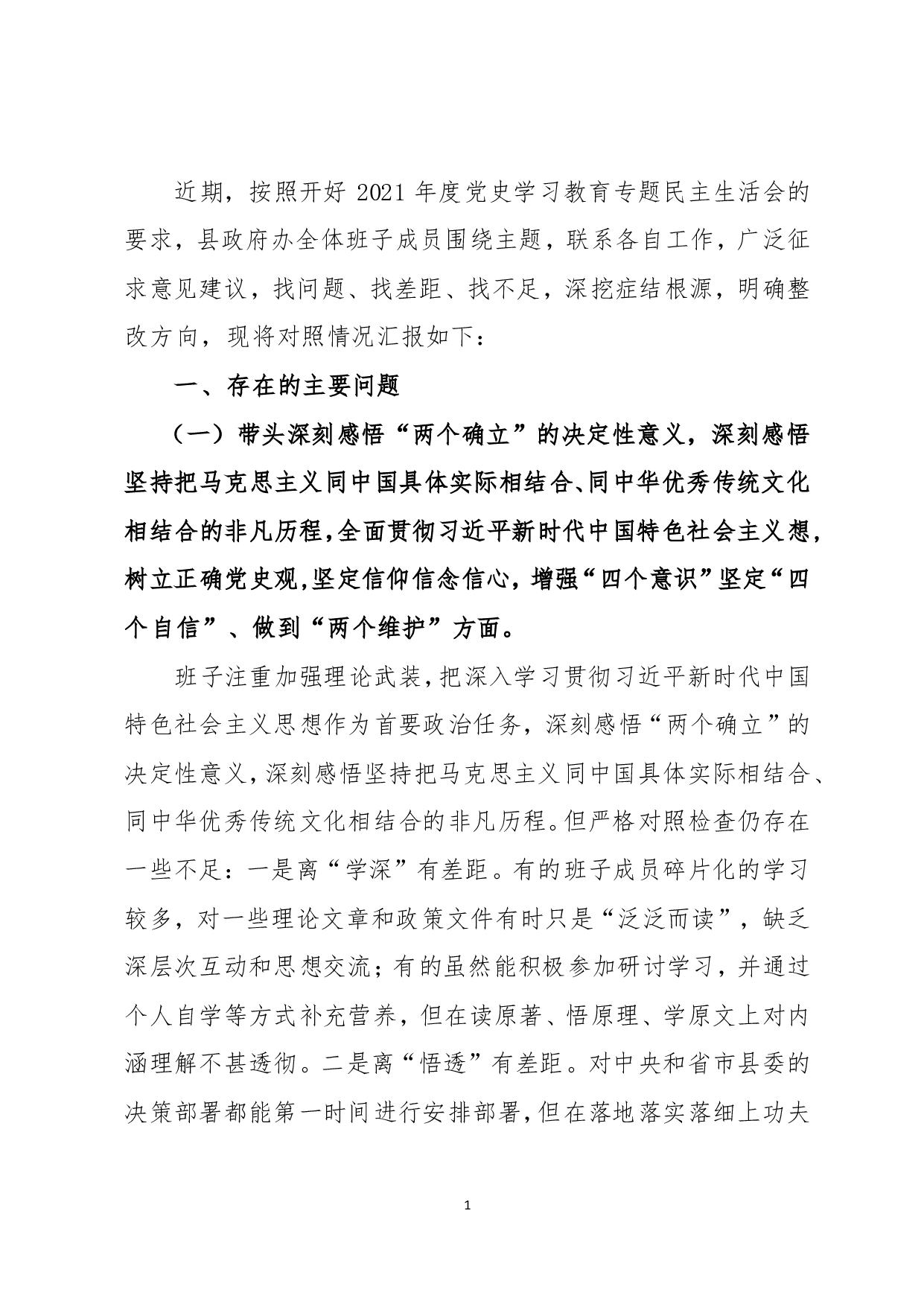 1近期,按照开好2021年度党史学习教育专题民主生活会的要求,县政府办全体班子成员围绕主题,联系各自工作,广泛征求意见建议,找问题、找差距、找不足,深挖症结根源,明确整改方向,现将对照情况汇报如下:一、存在的主要问题(一)带头深刻感悟“两个确立”的决定性意义,深刻感悟坚持把马克思主义同中国具体实际相结合、同中华优秀传统文化相结合的非凡历程,全面贯彻习近平新时代中国特色社会主义想,树立正确党史观,坚定信仰信念信心,增强“四个意识”坚定“四个自信”、做到“两个维护”方面。班子注重加强理论武装,把深入学习贯彻习近平新时代中国特色社会主义思想作为首要政治任务,深刻感悟“两个确立”的决定性意义,深刻感悟...