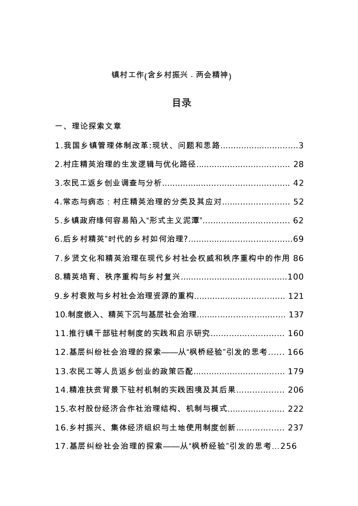 镇村工作(含乡村振兴·两会精神)目录一、理论探索文章1.我国乡镇管理体制改革:现状、问题和思路..............................32.村庄精英治理的生发逻辑与优化路径....................................283.农民工返乡创业调查与分析.................................................424.常态与病态:村庄精英治理的分类及其应对..........................525.乡镇政府缘何容易陷入“形式主义泥潭”...................................