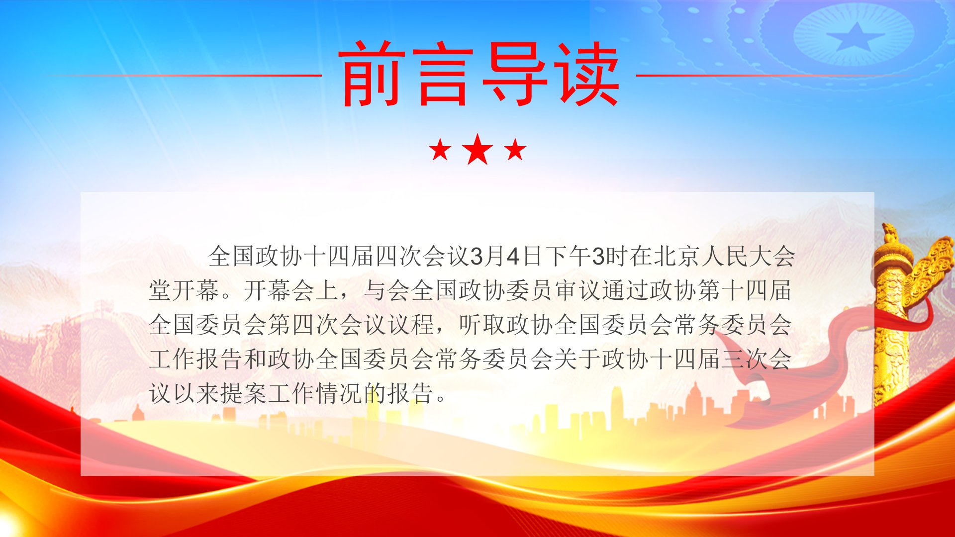学习政协第十四届全国委员会第四次会议讲话精神全国政协常委会工作报告全国政协常委会工作报告2026全国两会2026全国两会主讲人:时间:202X.X.X全国政协十四届四次会议3月4日下午3时在北京人民大会堂开幕。开幕会上,与会全国政协委员审议通过政协第十四届全国委员会第四次会议议程,听取政协全国委员会常务委员会工作报告和政协全国委员会常务委员会关于政协十四届三次会议以来提案工作情况的报告。CONTENTS学习政协第十四届全国委员会第四次会议讲话精神2025年主要工作2025年主要工作012025年主要工作面对错综复杂的国际形势和艰巨繁重的国内改革发展稳定任务,以习近平同志为核心的中共中央团结带领全党全国各族人民,迎难而上、奋力拼搏,统筹国内国际两个大局,顺利完成全年经济社会发展主要目标,我国经...