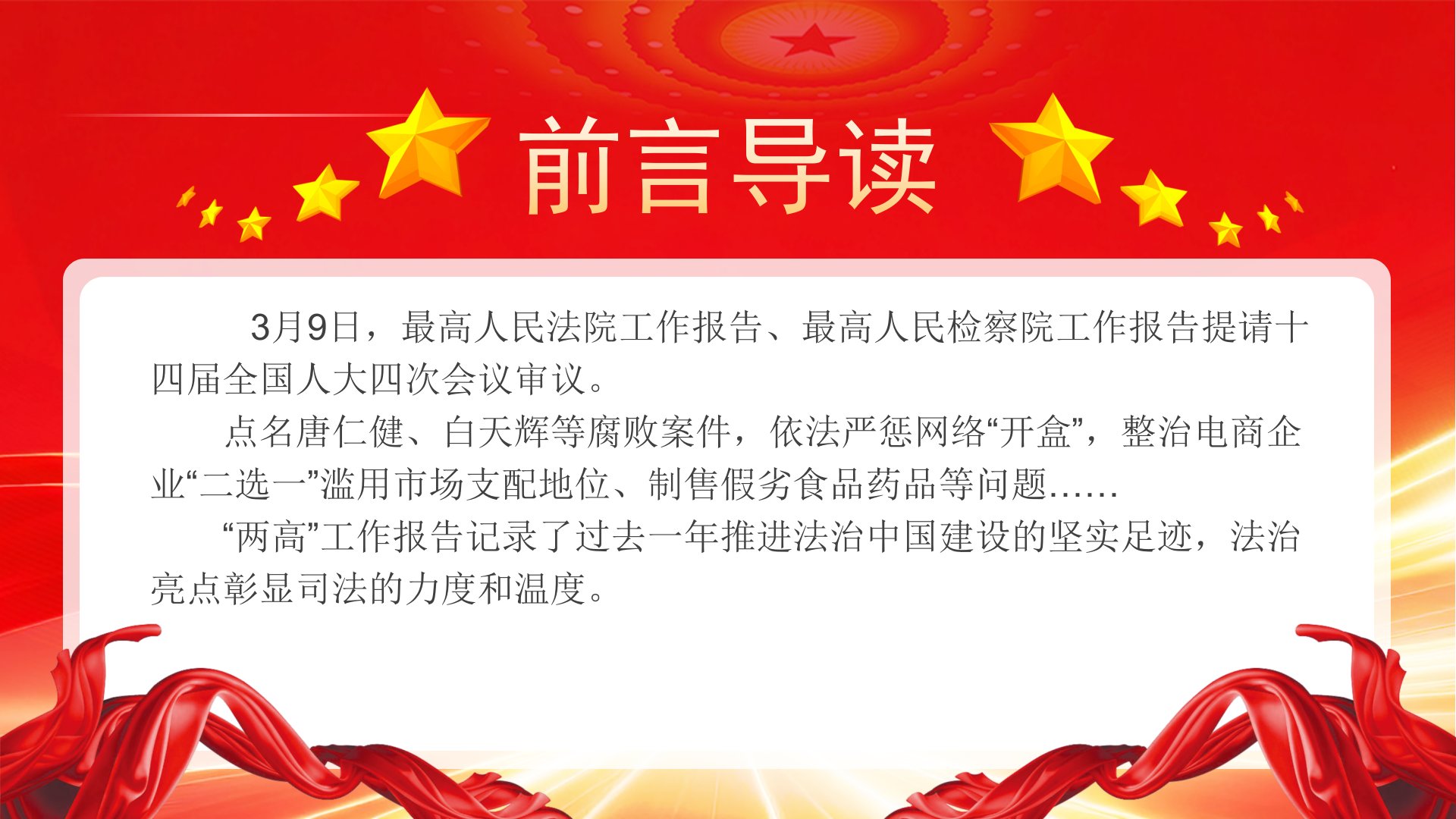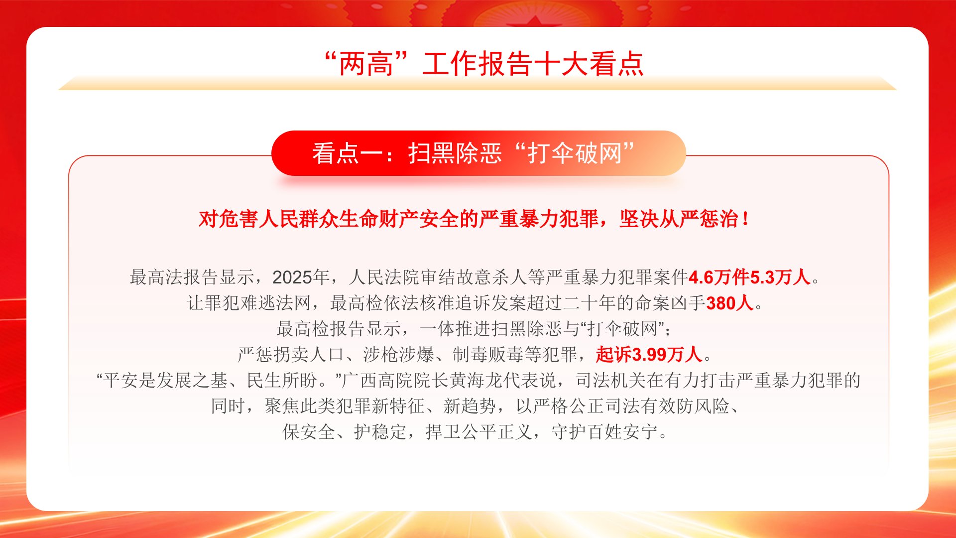 深入学习贯彻2026年全国两会精神党课PPT课件“两高”工作报告十大看点学习两会聚焦两会蓝/图/已/绘/就/奋/进/正/当/时3月9日,最高人民法院工作报告、最高人民检察院工作报告提请十四届全国人大四次会议审议。  点名唐仁健、白天辉等腐败案件,依法严惩网络“开盒”,整治电商企业“二选一”滥用市场支配地位、制售假劣食品药品等问题……  “两高”工作报告记录了过去一年推进法治中国建设的坚实足迹,法治亮点彰显司法的力度和温度。“两高”工作报告十大看点看点一:扫黑除恶“打伞破网”对危害人民群众生命财产安全的严重暴力犯罪,坚决从严惩治!最高法报告显示,2025年,人民法院审结故意杀人等严重暴力犯罪案件4.6万件5.3万人。让罪犯难逃法网,最高检依法核准追诉发案超过二十年的命案凶手380人。最高检报告...