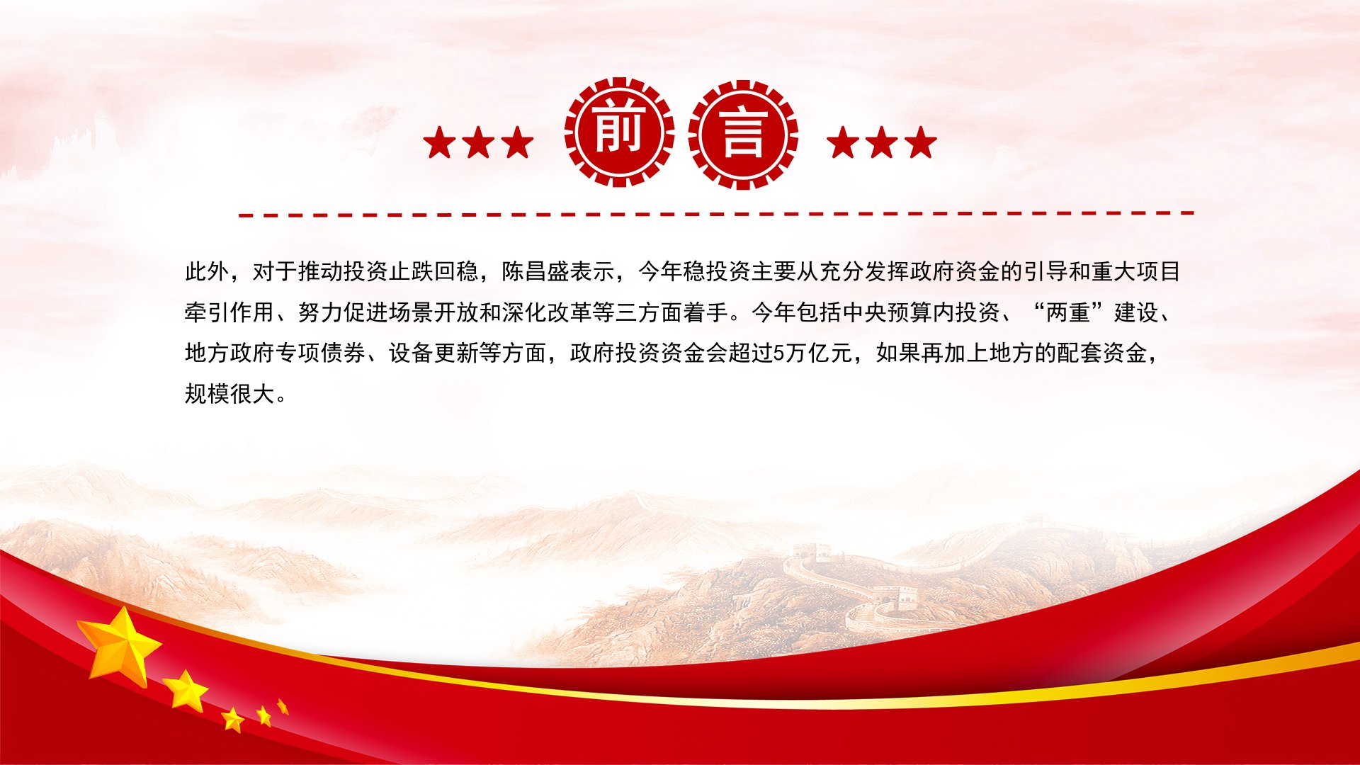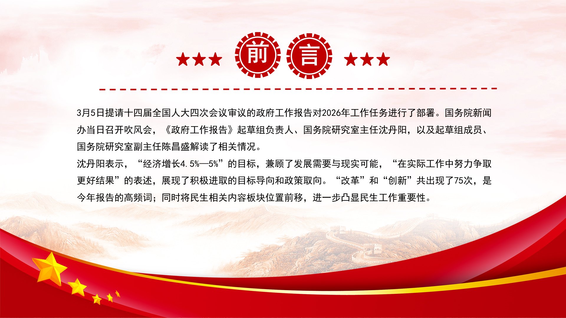 2026政府工作报告要点解读3月5日提请十四届全国人大四次会议审议的政府工作报告对2026年工作任务进行了部署。国务院新闻办当日召开吹风会,《政府工作报告》起草组负责人、国务院研究室主任沈丹阳,以及起草组成员、国务院研究室副主任陈昌盛解读了相关情况。沈丹阳表示,“经济增长4.5%—5%”的目标,兼顾了发展需要与现实可能,“在实际工作中努力争取更好结果”的表述,展现了积极进取的目标导向和政策取向。“改革”和“创新”共出现了75次,是今年报告的高频词;同时将民生相关内容板块位置前移,进一步凸显民生工作重要性。此外,对于推动投资止跌回稳,陈昌盛表示,今年稳投资主要从充分发挥政府资金的引导和重大项目牵引作用、努力促进场景开放和深化改革等三方面着手。今年包括中央预算内投资、“两重”建设、地方政府专项债...