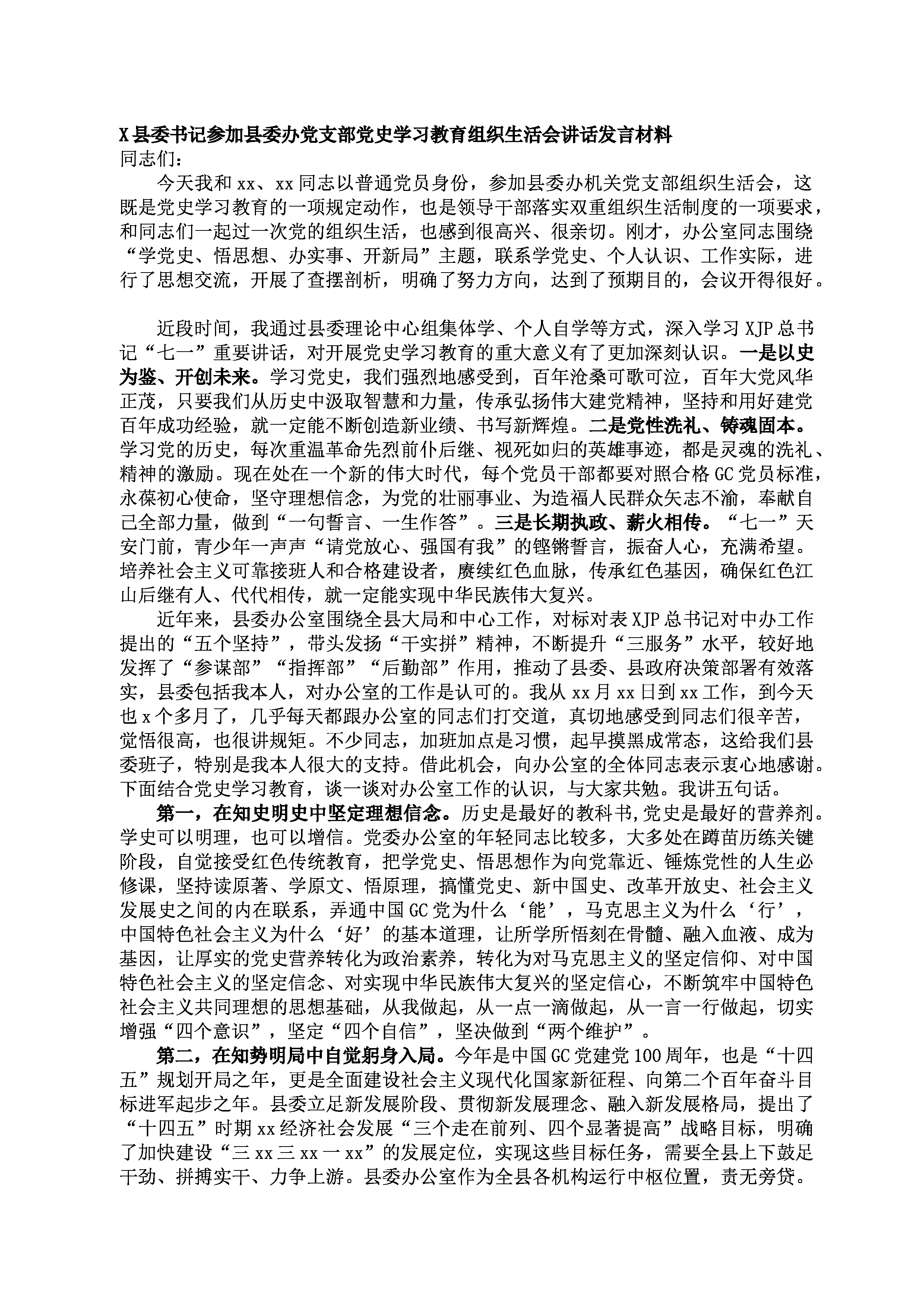 X县委书记参加县委办党支部党史学习教育组织生活会讲话发言材料