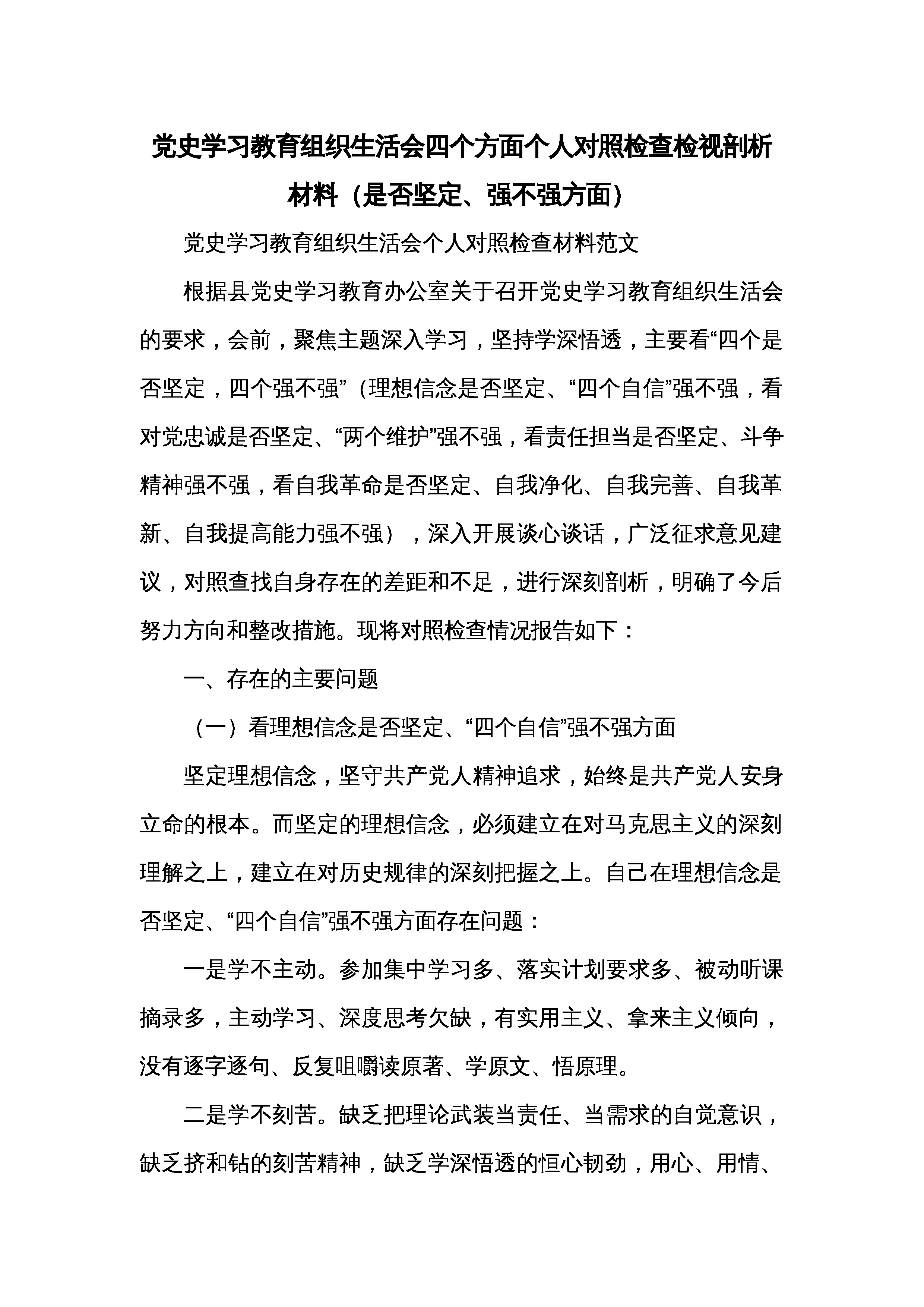 党史学习教育组织生活会四个方面个人对照检查检视剖析材料(是否坚定、强不强方面)党史学习教育组织生活会个人对照检查材料范文根据县党史学习教育办公室关于召开党史学习教育组织生活会的要求,会前,聚焦主题深入学习,坚持学深悟透,主要看“四个是否坚定,四个强不强”(理想信念是否坚定、“四个自信”强不强,看对党忠诚是否坚定、“两个维护”强不强,看责任担当是否坚定、斗争精神强不强,看自我革命是否坚定、自我净化、自我完善、自我革新、自我提高能力强不强),深入开展谈心谈话,广泛征求意见建议,对照查找自身存在的差距和不足,进行深刻剖析,明确了今后努力方向和整改措施。现将对照检查情况报告如下:一、存在的主要问题(一...