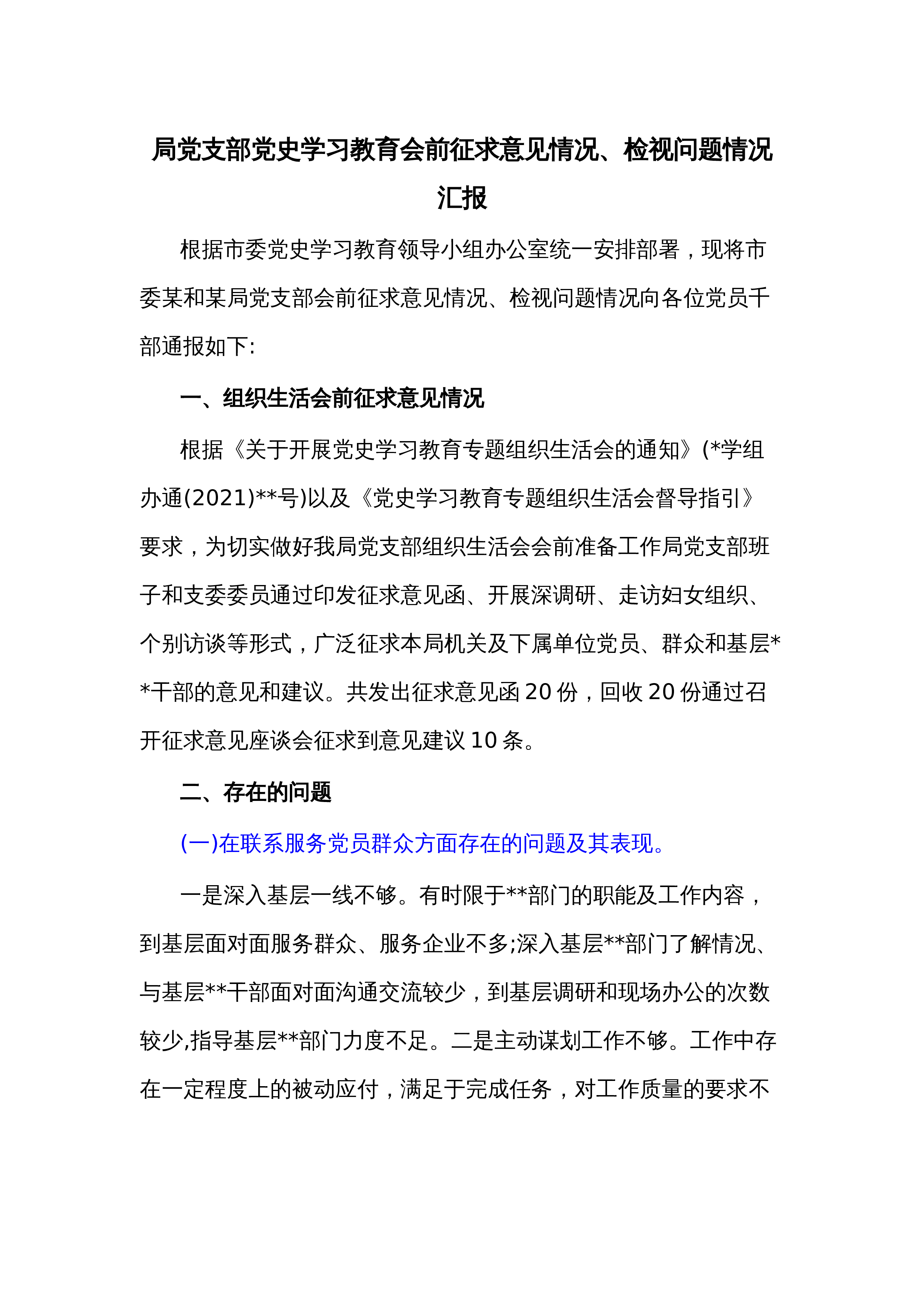 局党支部党史学习教育会前征求意见情况、检视问题情况汇报根据市委党史学习教育领导小组办公室统一安排部署,现将市委某和某局党支部会前征求意见情况、检视问题情况向各位党员千部通报如下:一、组织生活会前征求意见情况根据《关于开展党史学习教育专题组织生活会的通知》(*学组办通(2021)**号)以及《党史学习教育专题组织生活会督导指引》要求,为切实做好我局党支部组织生活会会前准备工作局党支部班子和支委委员通过印发征求意见函、开展深调研、走访妇女组织、个别访谈等形式,广泛征求本局机关及下属单位党员、群众和基层**干部的意见和建议。共发出征求意见函20份,回收20份通过召开征求意见座谈会征求到意见建议10条...