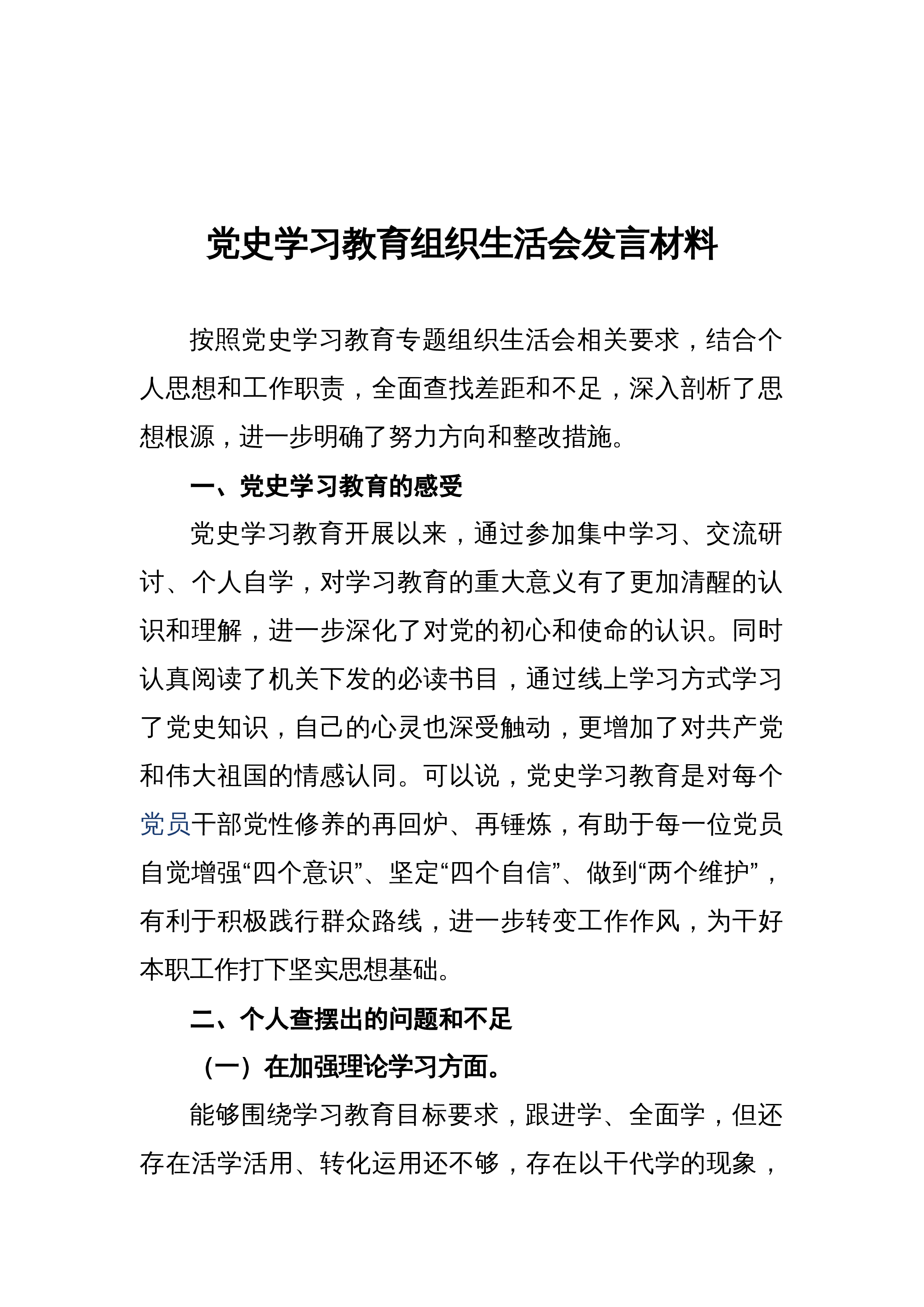 党史学习教育组织生活会发言材料按照党史学习教育专题组织生活会相关要求,结合个人思想和工作职责,全面查找差距和不足,深入剖析了思想根源,进一步明确了努力方向和整改措施。一、党史学习教育的感受党史学习教育开展以来,通过参加集中学习、交流研讨、个人自学,对学习教育的重大意义有了更加清醒的认识和理解,进一步深化了对党的初心和使命的认识。同时认真阅读了机关下发的必读书目,通过线上学习方式学习了党史知识,自己的心灵也深受触动,更增加了对共产党和伟大祖国的情感认同。可以说,党史学习教育是对每个党员干部党性修养的再回炉、再锤炼,有助于每一位党员自觉增强“四个意识”、坚定“四个自信”、做到“两个维护”,有利于积...