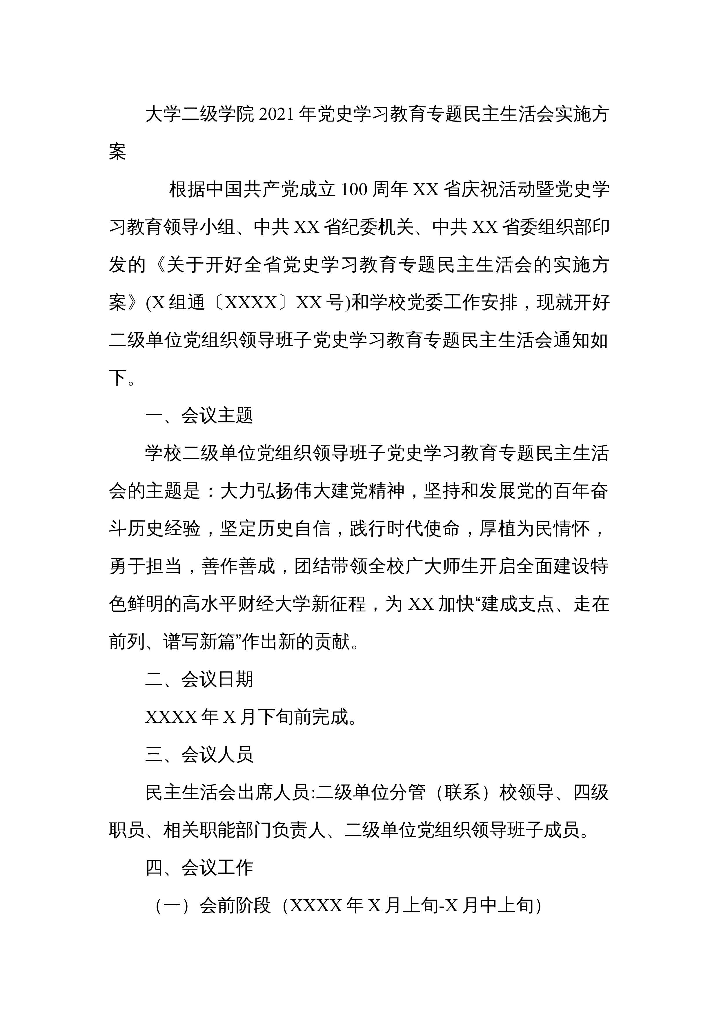 大学二级学院2021年党史学习教育专题民主生活会实施方案     根据中国共产党成立100周年XX省庆祝活动暨党史学习教育领导小组、中共XX省纪委机关、中共XX省委组织部印发的《关于开好全省党史学习教育专题民主生活会的实施方案》(X组通〔XXXX〕XX号)和学校党委工作安排,现就开好二级单位党组织领导班子党史学习教育专题民主生活会通知如下。一、会议主题学校二级单位党组织领导班子党史学习教育专题民主生活会的主题是:大力弘扬伟大建党精神,坚持和发展党的百年奋斗历史经验,坚定历史自信,践行时代使命,厚植为民情怀,勇于担当,善作善成,团结带领全校广大师生开启全面建设特色鲜明的高水平财经大学新征程,为X...