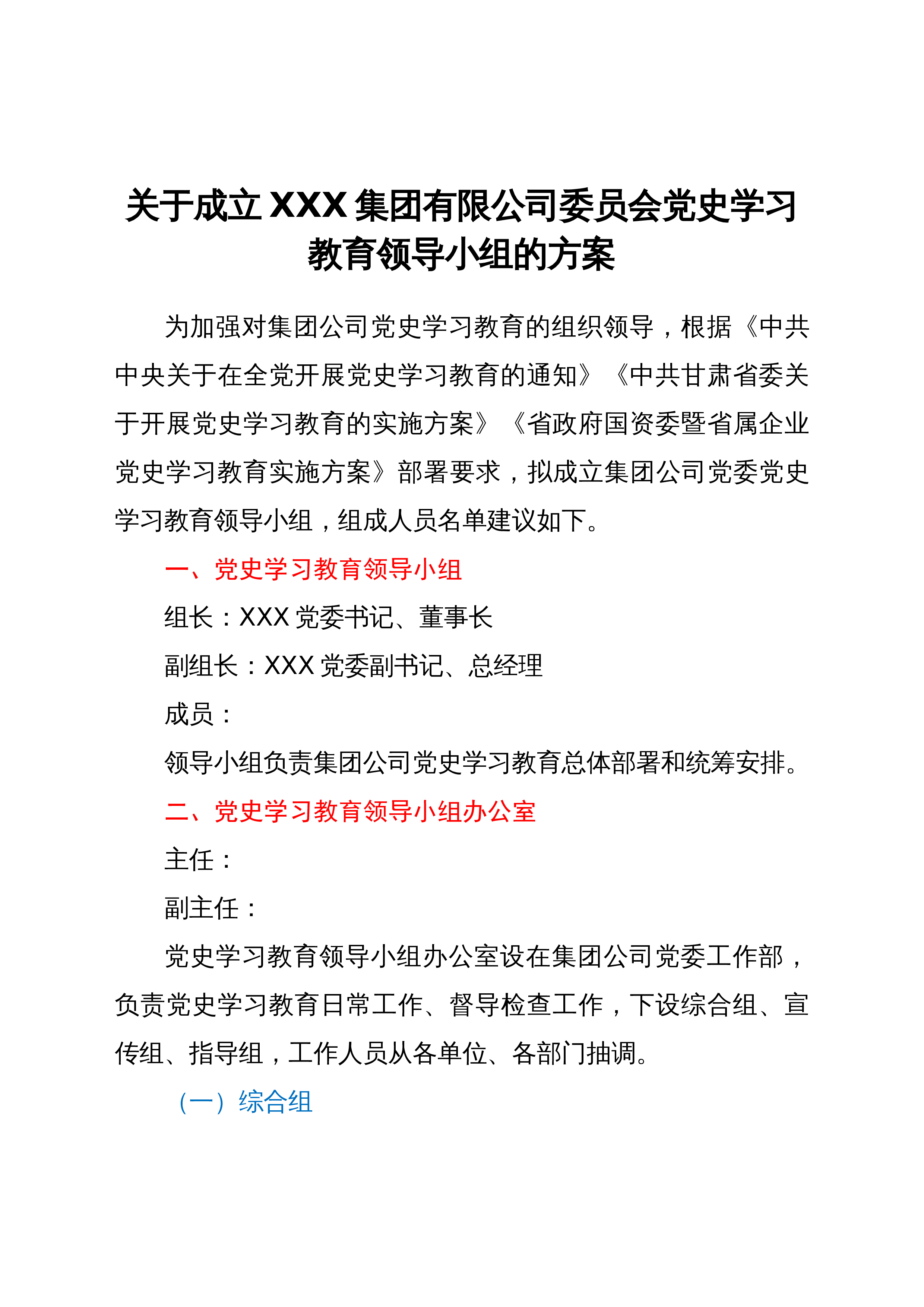 关于成立XXX集团有限公司委员会党史学习教育领导小组的方案为加强对集团公司党史学习教育的组织领导,根据《中共中央关于在全党开展党史学习教育的通知》《中共甘肃省委关于开展党史学习教育的实施方案》《省政府国资委暨省属企业党史学习教育实施方案》部署要求,拟成立集团公司党委党史学习教育领导小组,组成人员名单建议如下。一、党史学习教育领导小组组长:XXX党委书记、董事长副组长:XXX党委副书记、总经理成员:领导小组负责集团公司党史学习教育总体部署和统筹安排。二、党史学习教育领导小组办公室主任:副主任:党史学习教育领导小组办公室设在集团公司党委工作部,负责党史学习教育日常工作、督导检查工作,下设综合组、宣...