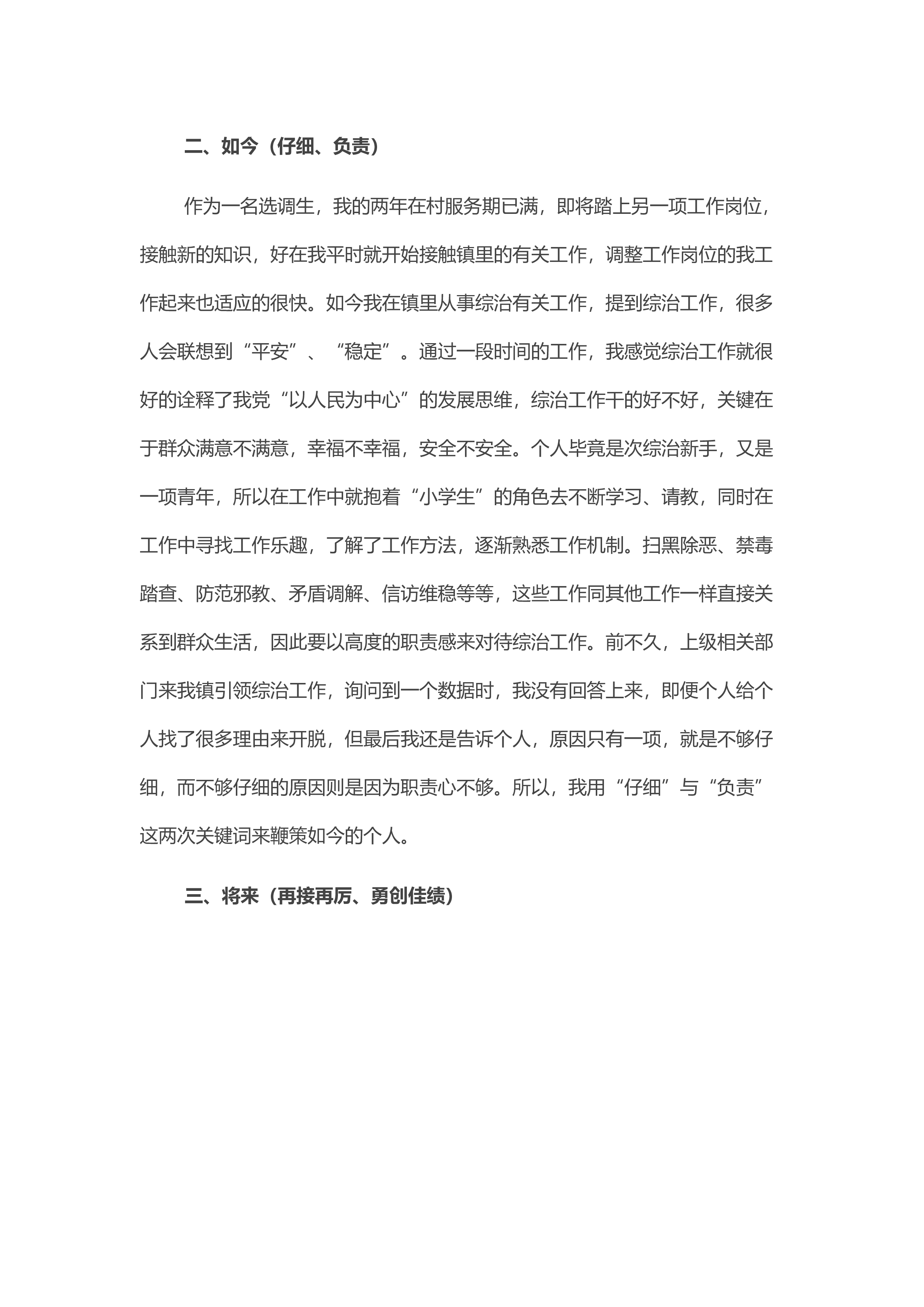 二、如今(仔细、负责)        作为一名选调生,我的两年在村服务期已满,即将踏上另一项工作岗位,接触新的知识,好在我平时就开始接触镇里的有关工作,调整工作岗位的我工作起来也适应的很快。如今我在镇里从事综治有关工作,提到综治工作,很多人会联想到“平安”、“稳定”。通过一段时间的工作,我感觉综治工作就很好的诠释了我党“以人民为中心”的发展思维,综治工作干的好不好,关键在于群众满意不满意,幸福不幸福,安全不安全。个人毕竟是次综治新手,又是一项青年,所以在工作中就抱着“小学生”的角色去不断学习、请教,同时在工作中寻找工作乐趣,了解了工作方法,逐渐熟悉工作机制。扫黑除恶、禁毒踏查、...