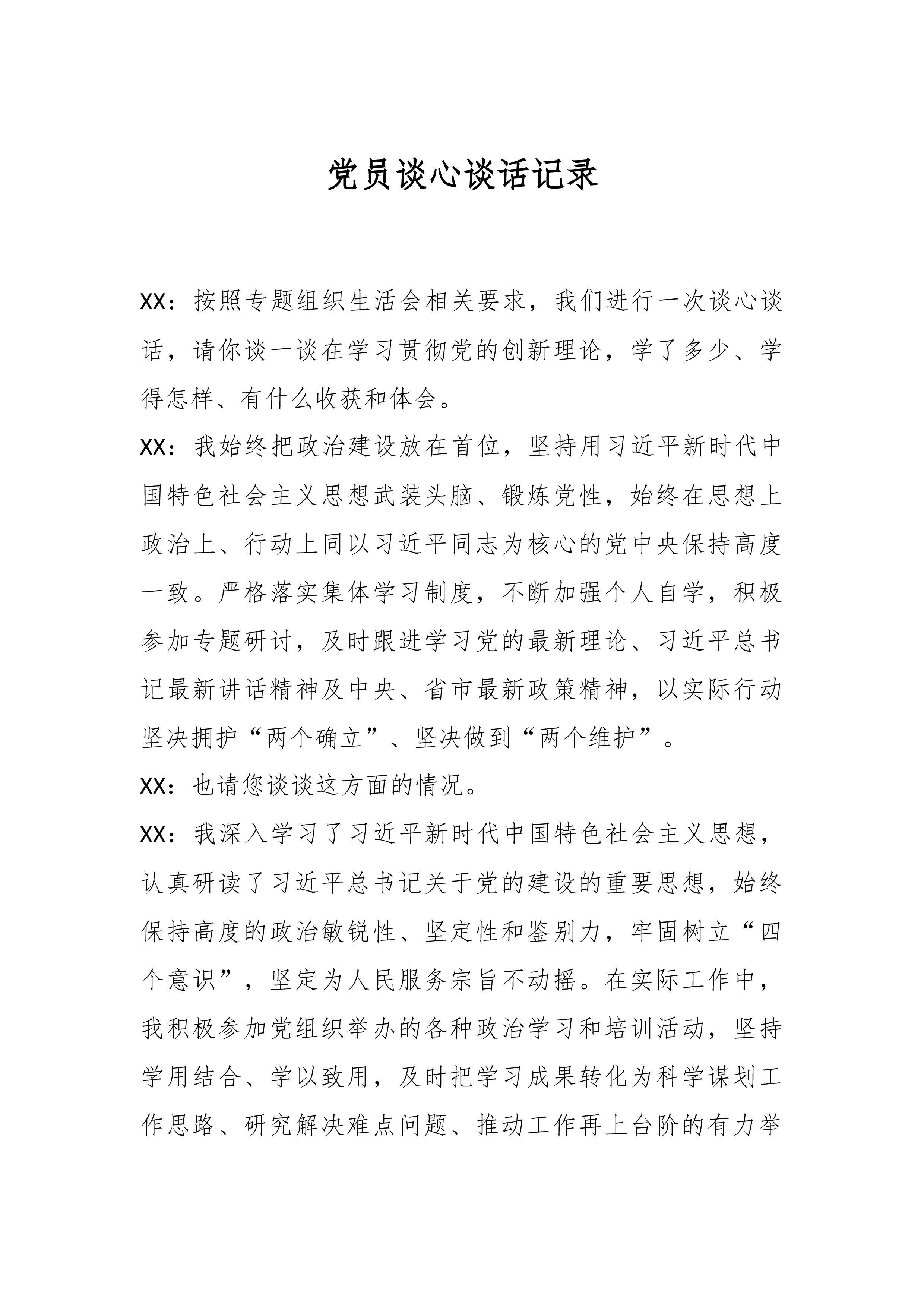 党员谈心谈话记录XX:按照专题组织生活会相关要求,我们进行一次谈心谈话,请你谈一谈在学习贯彻党的创新理论,学了多少、学得怎样、有什么收获和体会。XX:我始终把政治建设放在首位,坚持用习近平新时代中国特色社会主义思想武装头脑、锻炼党性,始终在思想上政治上、行动上同以习近平同志为核心的党中央保持高度一致。严格落实集体学习制度,不断加强个人自学,积极参加专题研讨,及时跟进学习党的最新理论、习近平总书记最新讲话精神及中央、省市最新政策精神,以实际行动坚决拥护“两个确立”、坚决做到“两个维护”。XX:也请您谈谈这方面的情况。XX:我深入学习了习近平新时代中国特色社会主义思想,认真研读了习近平总书记关于党...