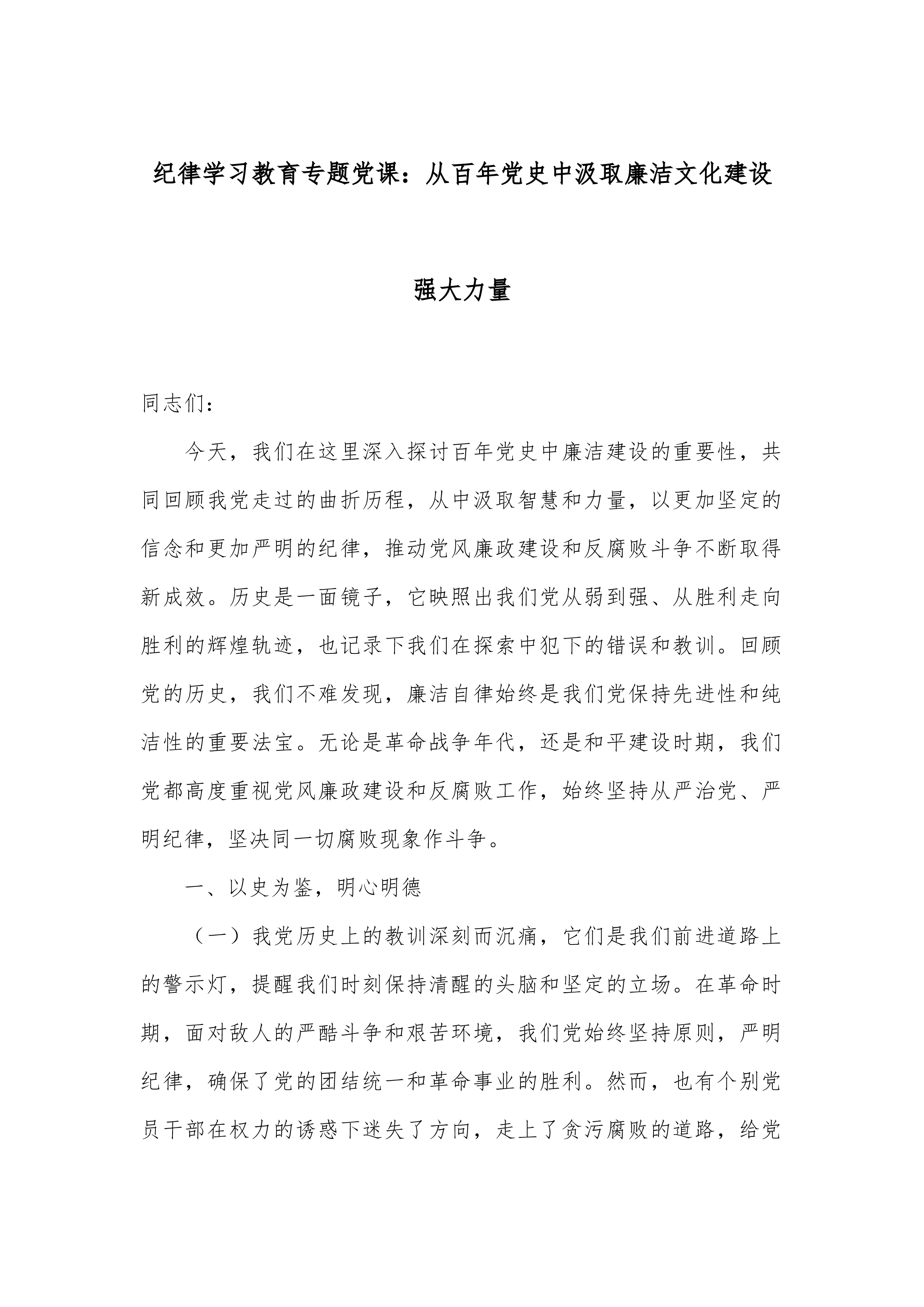 纪律学习教育专题党课:从百年党史中汲取廉洁文化建设强大力量同志们:  今天,我们在这里深入探讨百年党史中廉洁建设的重要性,共同回顾我党走过的曲折历程,从中汲取智慧和力量,以更加坚定的信念和更加严明的纪律,推动党风廉政建设和反腐败斗争不断取得新成效。历史是一面镜子,它映照出我们党从弱到强、从胜利走向胜利的辉煌轨迹,也记录下我们在探索中犯下的错误和教训。回顾党的历史,我们不难发现,廉洁自律始终是我们党保持先进性和纯洁性的重要法宝。无论是革命战争年代,还是和平建设时期,我们党都高度重视党风廉政建设和反腐败工作,始终坚持从严治党、严明纪律,坚决同一切腐败现象作斗争。  一、以史为鉴,明心明德  (一)...