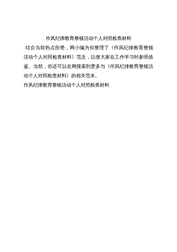 作风纪律教育整顿活动个人对照检查材料结合当前热点形势,网小编为你整理了《作风纪律教育整顿活动个人对照检查材料》范文,以便大家在工作学习时参照借鉴。当然,你还可以在网搜索到更多与《作风纪律教育整顿活动个人对照检查材料》的相关范本。作风纪律教育整顿活动个人对照检查材料为了进一步加强公安机关作风建设,切实解决公安队伍中存在的突出问题,教育引导广大公安民警进一步解放思想、与时俱进、开拓创新,大力弘扬求真务实精神,打造一支作风过硬的公安队伍。进一步加强警察作风建设的有关要求,切实解决警察队伍中存在的突出问题,教育引导广大民警进一步解放思想、与时俱进、开拓创新,大力弘扬求真务实精神,打造一支作风过硬的警察...