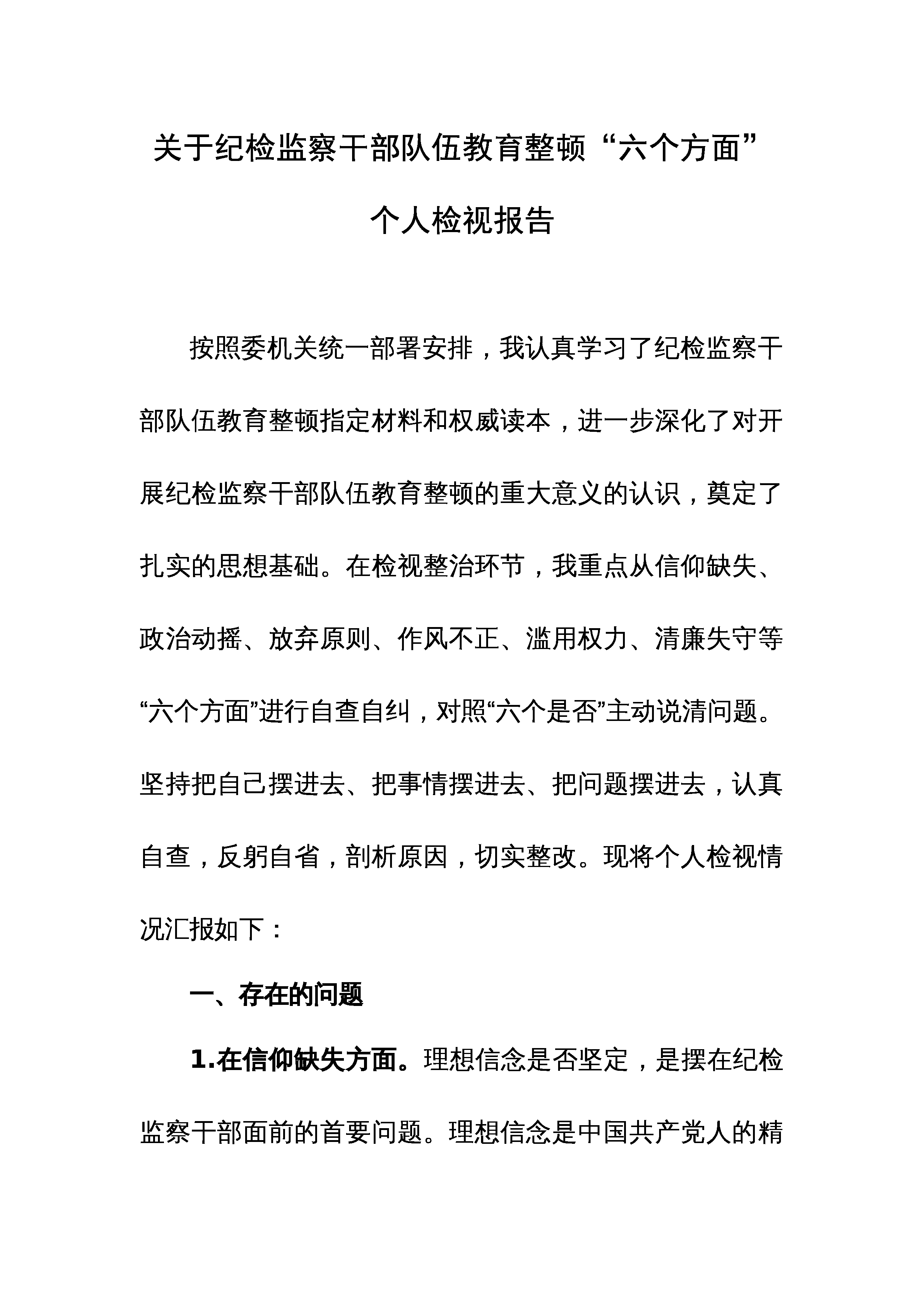2023纪检监察干部队伍教育整顿“六个方面”个人检视剖析材料共四篇(信仰缺失、政治动摇、放弃原则、作风不正、滥用权力、清廉失守方面)【一】根据委机关党委要求,自己积极参加了纪检监察干部教育整顿,并在学习教育环节参加了思想政治教育、纪律警示教育等活动,系统地学习了党中央重大决策部署和习近平总书记重要讲话、重要指示批示精神,中央重要会议、重要情况通报等相关文件,观看了警示教育片、聆听领导廉政教育报告等,自己心灵深处受到很大启发,接受了一次全面的、深刻的教育,思想上受到了洗礼。在检视整治环节,我重点围绕信仰缺失、政治动摇、放弃原则、作风不正、滥用权力、清廉失守等"六个方面"进行自查自纠,并结合自己的...