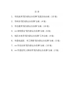 目录1、市民政局“我为群众办实事”实践活动台账(10项)2、市科协“我为群众办实事”台账(4项)3、市住建局“我为群众办实事”台账(16项)4、xx湖管委会“我为群众办实事”台账(6项)5、地区水务局“我为群众办实事”工作台账(4项)6、市委统战部、市工商联“我为群众办实事”台账(5项)7、xx市信访局“我为群众办实事”台账(10项)8、xx市退役军人事务局“我为群众办实事”台账(2项)市民政局“我为群众办实事”实践活动台账序号活动项目具体内容责任科室完成时限1推进社会救助精准度进一步提高。确认权下放乡镇(街道)试点工作,将社会救助县、乡两级办理变为试点乡镇(街道)一级办理,减少社会救助确...