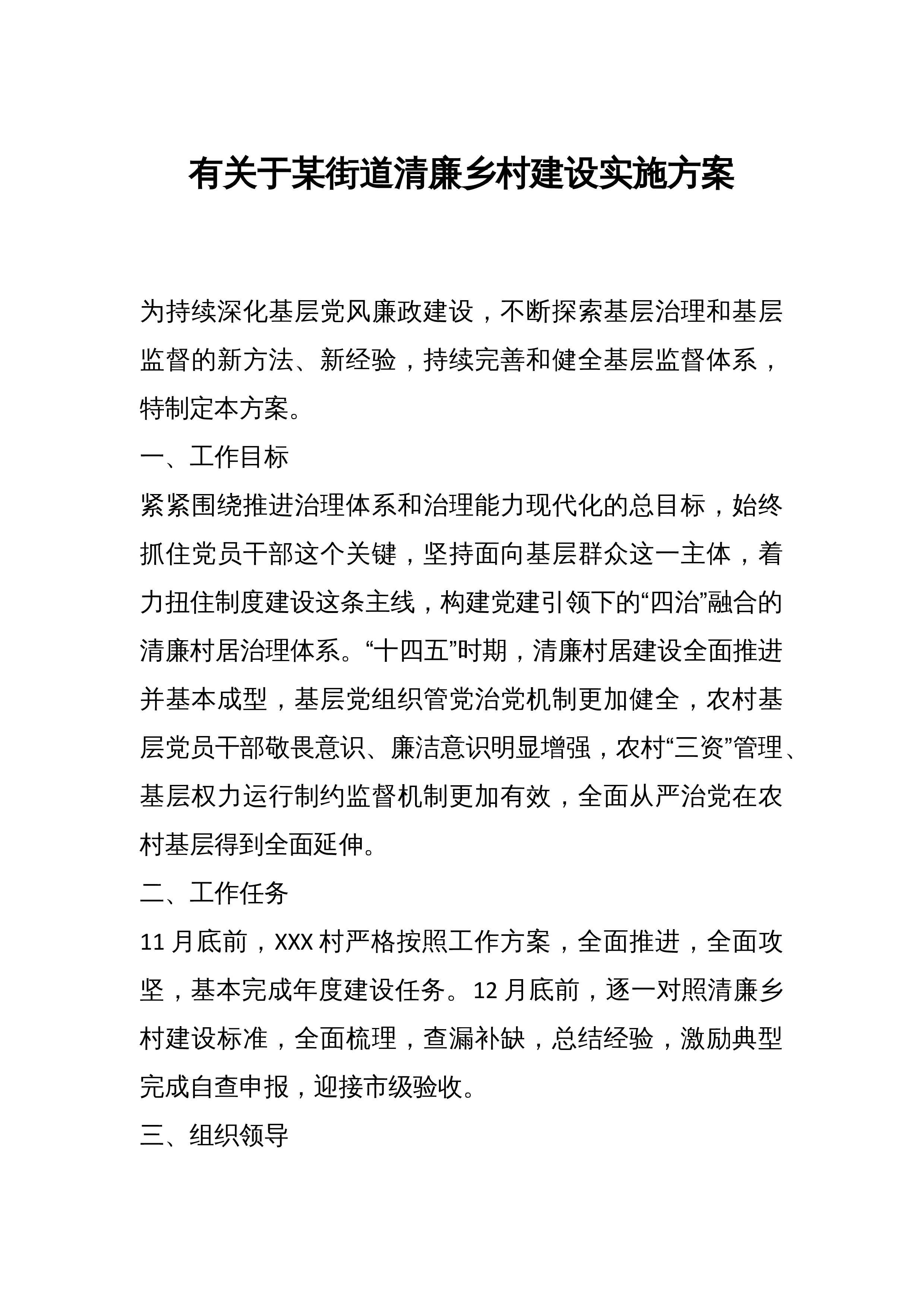有关于某街道清廉乡村建设实施方案为持续深化基层党风廉政建设,不断探索基层治理和基层监督的新方法、新经验,持续完善和健全基层监督体系,特制定本方案。一、工作目标紧紧围绕推进治理体系和治理能力现代化的总目标,始终抓住党员干部这个关键,坚持面向基层群众这一主体,着力扭住制度建设这条主线,构建党建引领下的“四治”融合的清廉村居治理体系。“十四五”时期,清廉村居建设全面推进并基本成型,基层党组织管党治党机制更加健全,农村基层党员干部敬畏意识、廉洁意识明显增强,农村“三资”管理、基层权力运行制约监督机制更加有效,全面从严治党在农村基层得到全面延伸。二、工作任务11月底前,XXX村严格按照工作方案,全面推进...