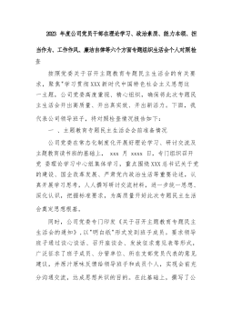 2023年度公司党员干部在理论学习、政治素质、能力本领、担当作为、工作作风、廉洁自律等六个方面专题组织生活会个人对照检查按照党委关于召开主题教育专题民主生活会的有关要求,聚焦"学习贯彻XXX新时代中国特色社会主义思想这一主题,公司党委高度重视、精心组织,确保将此次专题民主生活会开出高质量、开出真实效、开出新活力。下面,我代表公司领导班子,将对照检查情况报告如下:一、主题教育专题民主生活会会前准备情况公司党委在常态化制度化开展好理论学习、研讨交流及主题教育读书班的基础上,xxx月xxxx日,专门组织召开党委理论学习中心组集体学习,重点围绕习近平总书记关于党的建设、国企改革发展、严肃党内政治生活等...