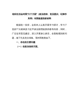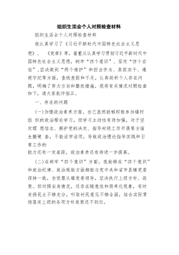 组织生活会个人对照检查材料组织生活会个人对照检查材料我认真学习了《习近平新时代中国特色社会主义思想》、《党章》等,着重从认真学习贯彻习近平新时代中国特色社会主义思想,树牢“四个意识”、坚定“四个自信”,坚决做到“两个维护”和担当作为、真抓实干、遵规守纪等方面,查找差距和不足,认真剖析个人存在问题,明确了努力方向和整改措施。现将有关情况对照检查如下,请大家批评指正。一、存在的问题(一)加强政治素养方面。自己虽然能够积极参加镇村组织的政治理论学习,但学习主动性有待加强,对于坚定理想信念、拥护党的决定、指导村级工作开展等方面生搬硬套,不能活学活用,导致政治理论指导实践和日常工作的能力还有一定差距,政...