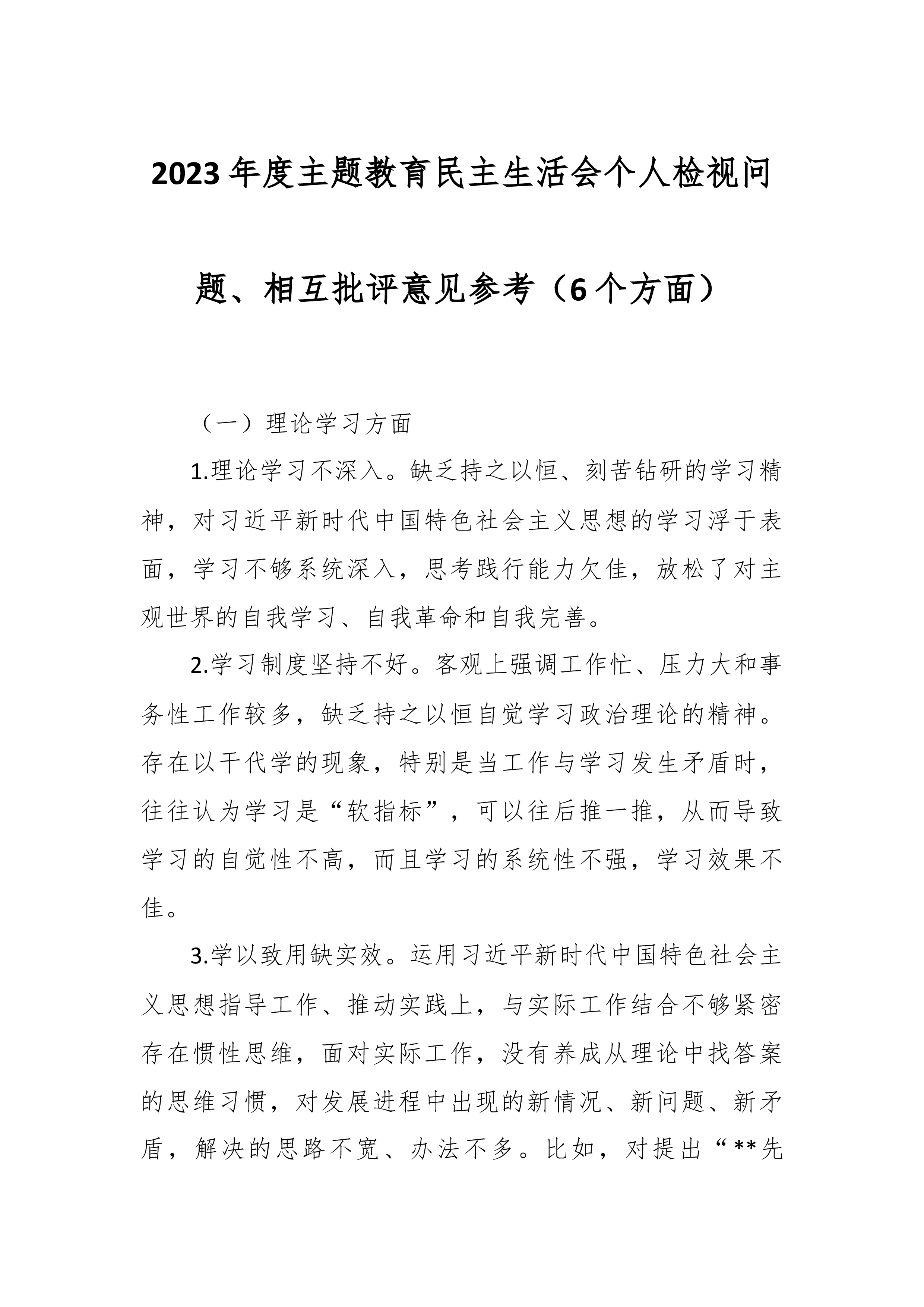 2023年度主题教育民主生活会个人检视问题、相互批评意见参考(6个方面)