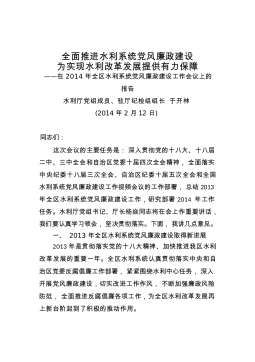 全面推进水利系统党风廉政建设为实现水利改革发展提供有力保障——在2014年全区水利系统党风廉政建设工作会议上的报告水利厅党组成员、驻厅纪检组组长于开林(2014年2月12日)同志们:这次会议的主要任务是:深入贯彻党的十八大、十八届二中、三中全会和自治区党委十届四次全会精神,全面落实中央纪委十八届三次全会、自治区纪委十届五次全会和全国水利系统党风廉政建设工作视频会议的工作部署,总结2013年全区水利系统党风廉政建设工作,研究部署2014年工作任务。水利厅党组书记、厅长杨焱同志将在会上作重要讲话,我们要认真学习领会,坚决贯彻落实。下面,我讲几点意见。一、2013年全区水利系统党风廉政建设取得新进展...