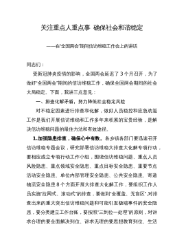 关注重点人重点事确保社会和谐稳定——在“全国两会”期间信访维稳工作会上的讲话同志们:受新冠肺炎疫情的影响,全国两会延迟了3个月召开,为了做好“全国两会”期间的信访维稳工作,确保全国两会期间的社会大局稳定。下面,我讲三点意见:一、排查化解矛盾,努力降低社会稳定风险对不稳定因素进行排查和化解,做好人员稳控和应急劝返工作是我们开展信访维稳和工作多年来积累的宝贵经验,是解决信访维稳问题的最佳方法和有效途径。1.加强隐患排查,确保心中有数。各乡镇各部门要迅速召开信访维稳专题会议,研究部署信访维稳大排查大化解专项行动,要相应成立专项行动工作小组,围绕信访维稳问题、重点人员风险隐患、重点领域安全隐患、重点目...