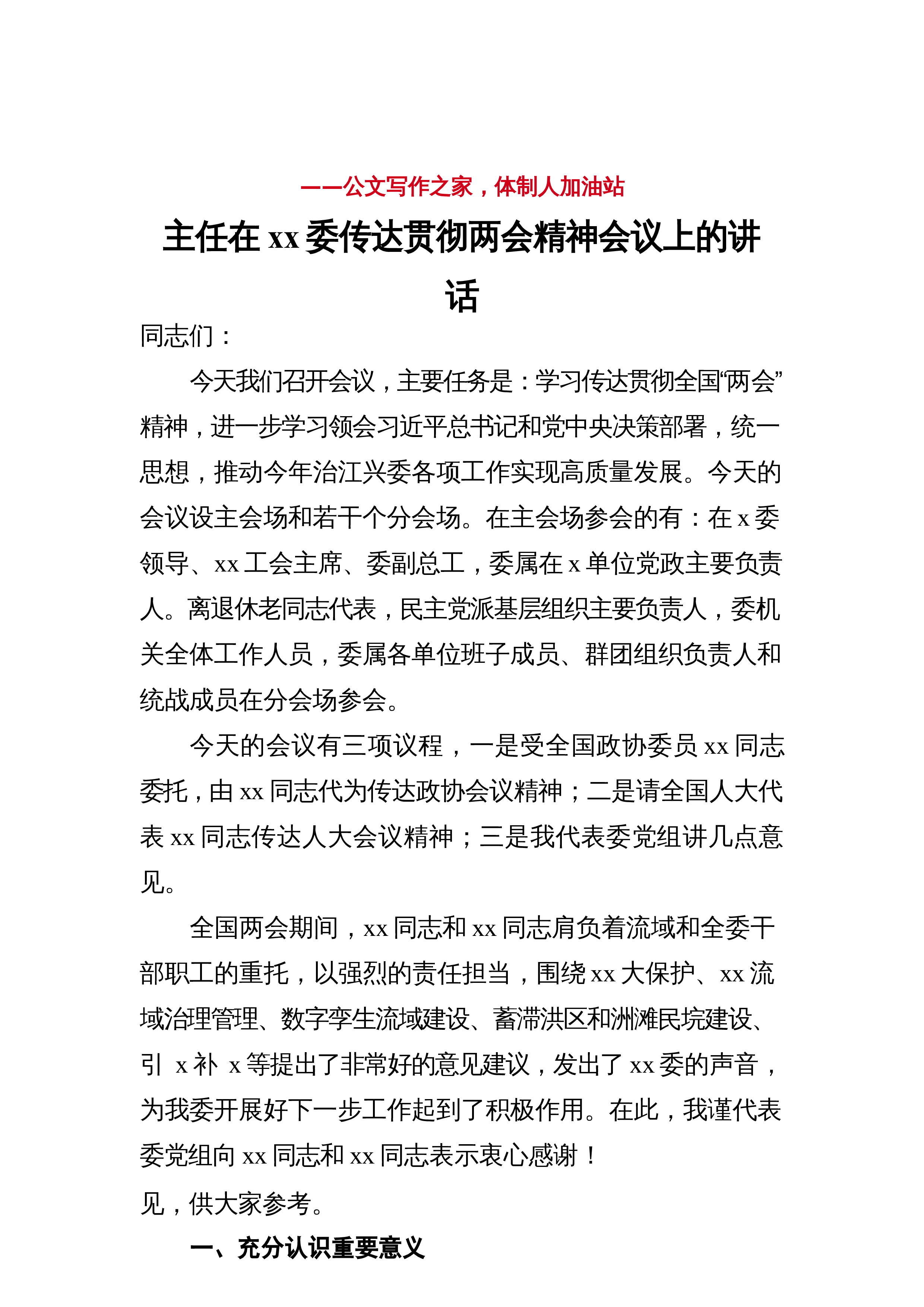 关注重点人重点事确保社会和谐稳定——在“全国两会”期间信访维稳工作会上的讲话同志们:受新冠肺炎疫情的影响,全国两会延迟了3个月召开,为了做好“全国两会”期间的信访维稳工作,确保全国两会期间的社会大局稳定。下面,我讲三点意见:一、排查化解矛盾,努力降低社会稳定风险对不稳定因素进行排查和化解,做好人员稳控和应急劝返工作是我们开展信访维稳和工作多年来积累的宝贵经验,是解决信访维稳问题的最佳方法和有效途径。1.加强隐患排查,确保心中有数。各乡镇各部门要迅速召开信访维稳专题会议,研究部署信访维稳大排查大化解专项行动,要相应成立专项行动工作小组,围绕信访维稳问题、重点人员风险隐患、重点领域安全隐患、重点目...