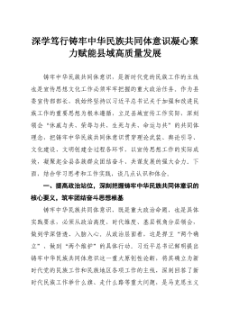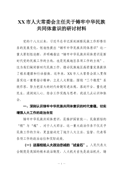 XX县委宣传部部长关于铸牢中华民族共同体意识的研讨材料铸牢中华民族共同体意识 凝聚中国式现代化XX篇章磅礴力量 同志们: 党的十八大以来,习近平总书记站在实现中华民族伟大复兴的战略高度,深刻提出“铸牢中华民族共同体意识是新时代党的民族工作的主线,也是民族地区各项工作的主线”。这一重大论断,为我们做好新时代党的民族工作和宣传思想文化工作指明了前进方向、提供了根本遵循。作为县委宣传部部长,我深感责任重大,必须带头学深悟透,并将其贯穿于宣传思想文化工作的全过程、各领域。下面,结合我县实际和工作职责,我谈几点认识和体会。 一、提高政治站位,深刻认识铸牢中华民族共同体意识的极端重要性,把稳思想之“舵” 铸牢中华民族共同体意识,不仅是民族工作的主线,也是我们宣传思想文化战线必须牢牢把握的战略...