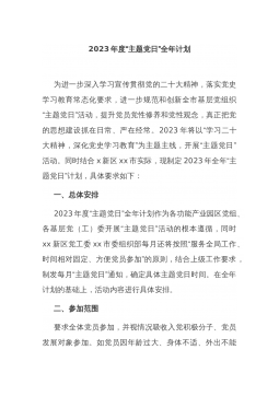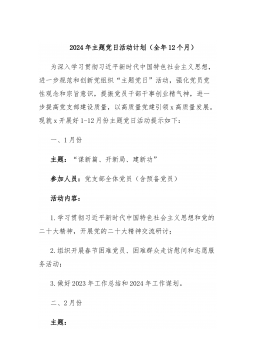 2024年主题党日活动计划(全年12个月)为深入学习贯彻习近平新时代中国特色社会主义思想,进一步规范和创新党组织“主题党日”活动,强化党员党性观念和宗旨意识,提振党员干部干事创业精气神,进一步提高党支部建设质量,以高质量党建引领x高质量发展。现就x开展好1-12月份主题党日活动提示如下:一、1月份主题:“谋新篇、开新局、建新功”参加人员:党支部全体党员(含预备党员)活动内容:1.学习贯彻习近平新时代中国特色社会主义思想和党的二十大精神,开展党的二十大精神交流研讨;2.组织开展春节困难党员、困难群众走访慰问和志愿服务活动;3.做好2023年工作总结和2024年工作谋划。二、2月份主题:1.“踔厉...