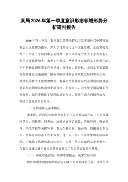 某局2026年第一季度意识形态领域形势分析研判报告2026年第一季度,我局党组始终坚持以习近平新时代中国特色社会主义思想为指导,深入学习践行习近平文化思想,全面贯彻党的二十大及二十届四中全会精神,坚决落实党中央关于意识形态工作的决策部署和省、市委工作要求,严格落实意识形态工作责任制,牢牢掌握意识形态工作领导权、管理权、话语权。全局上下紧紧围绕加快建设交通强国、服务保障经济社会高质量发展的中心任务,持续巩固壮大主流思想舆论,有效防范化解意识形态领域风险挑战,意识形态领域总体态势平稳可控、积极向上,为全年交通运输工作开好局、起好步提供了坚强的思想保证、凝聚了强大的精神动力、营造了良好的舆论氛围。一、总体态势及基本情况本季度,我局坚持将意识形态工作与交通运输中心工作同部署同落实、同检查、同考核,统...