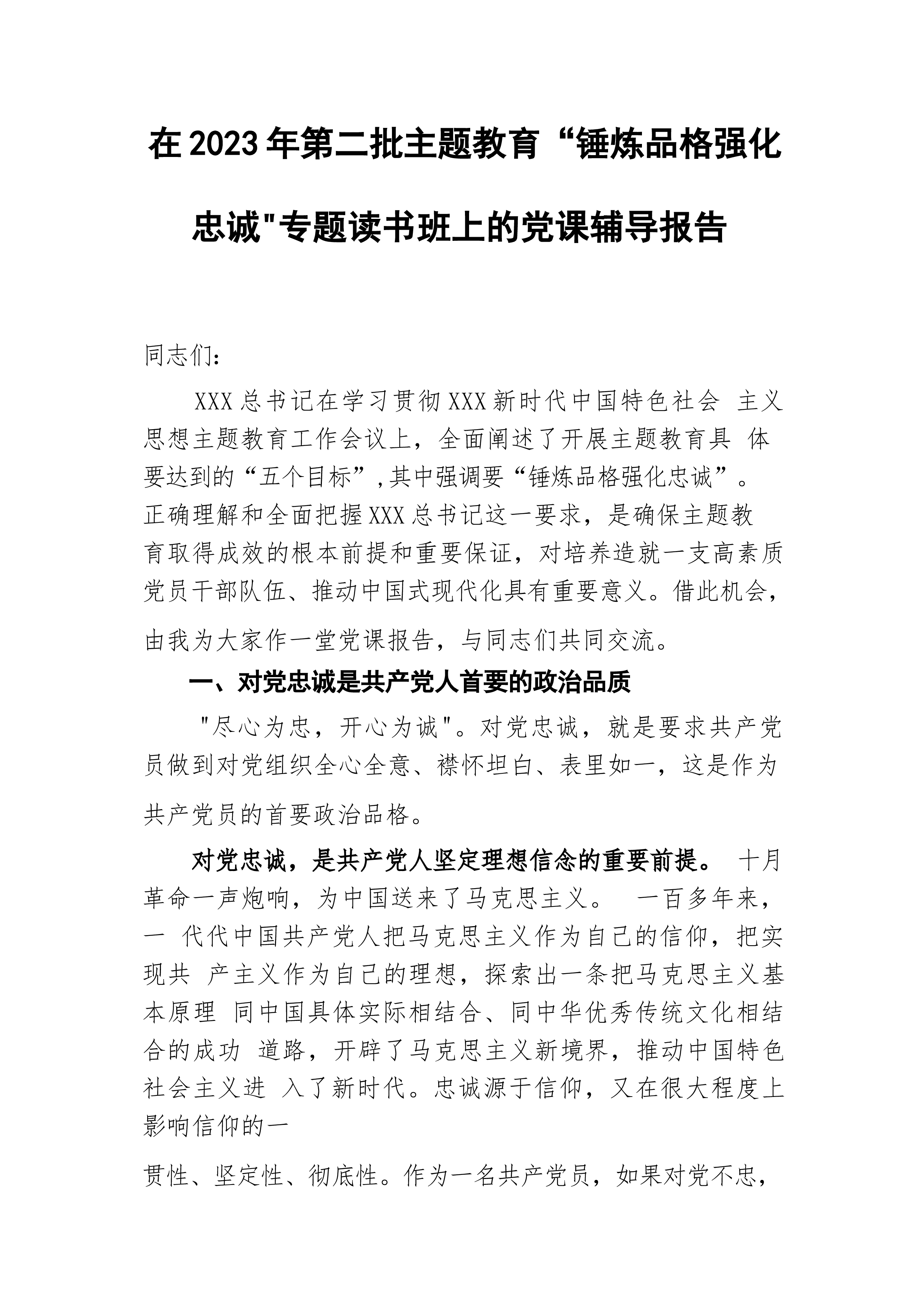 在2023年第二批主题教育“锤炼品格强化忠诚"专题读书班上的党课辅导报告同志们:习近平总书记在学习贯彻XXX新时代中国特色社会主义思想主题教育工作会议上,全面阐述了开展主题教育具体要达到的“五个目标”,其中强调要“锤炼品格强化忠诚”。正确理解和全面把握习近平总书记这一要求,是确保主题教育取得成效的根本前提和重要保证,对培养造就一支高素质党员干部队伍、推动中国式现代化具有重要意义。借此机会,由我为大家作一堂党课报告,与同志们共同交流。一、对党忠诚是共产党人首要的政治品质"尽心为忠,开心为诚"。对党忠诚,就是要求共产党员做到对党组织全心全意、襟怀坦白、表里如一,这是作为共产党员的首要政治品格。对党...