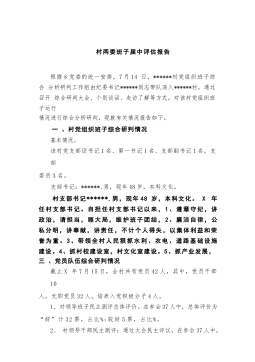 村两委班子届中评估报告根据乡党委的统一安排,7月14日,******村党组织班子综合分析研判工作组由纪委书记******同志带队深入******村,通过召开综合研判大会、个别谈话、走访了解等方式,对该村党组织班子运行情况进行综合分析研判,现就有关情况报告如下。一、村党组织班子综合研判情况基本情况。该村党支部设书记1名、第一书记1名、支部副书记1名,支部委员3名。支部书记:******,男,现年48岁,本科文化。村支部书记******,男,现年48岁,本科文化。X年任村支部书记。自担任村支部书记以来,1、遵章守纪,讲政治,请担当,顾大局,维护班子团结,2、廉洁自律,公私分明,讲奉献,讲责任,不计...