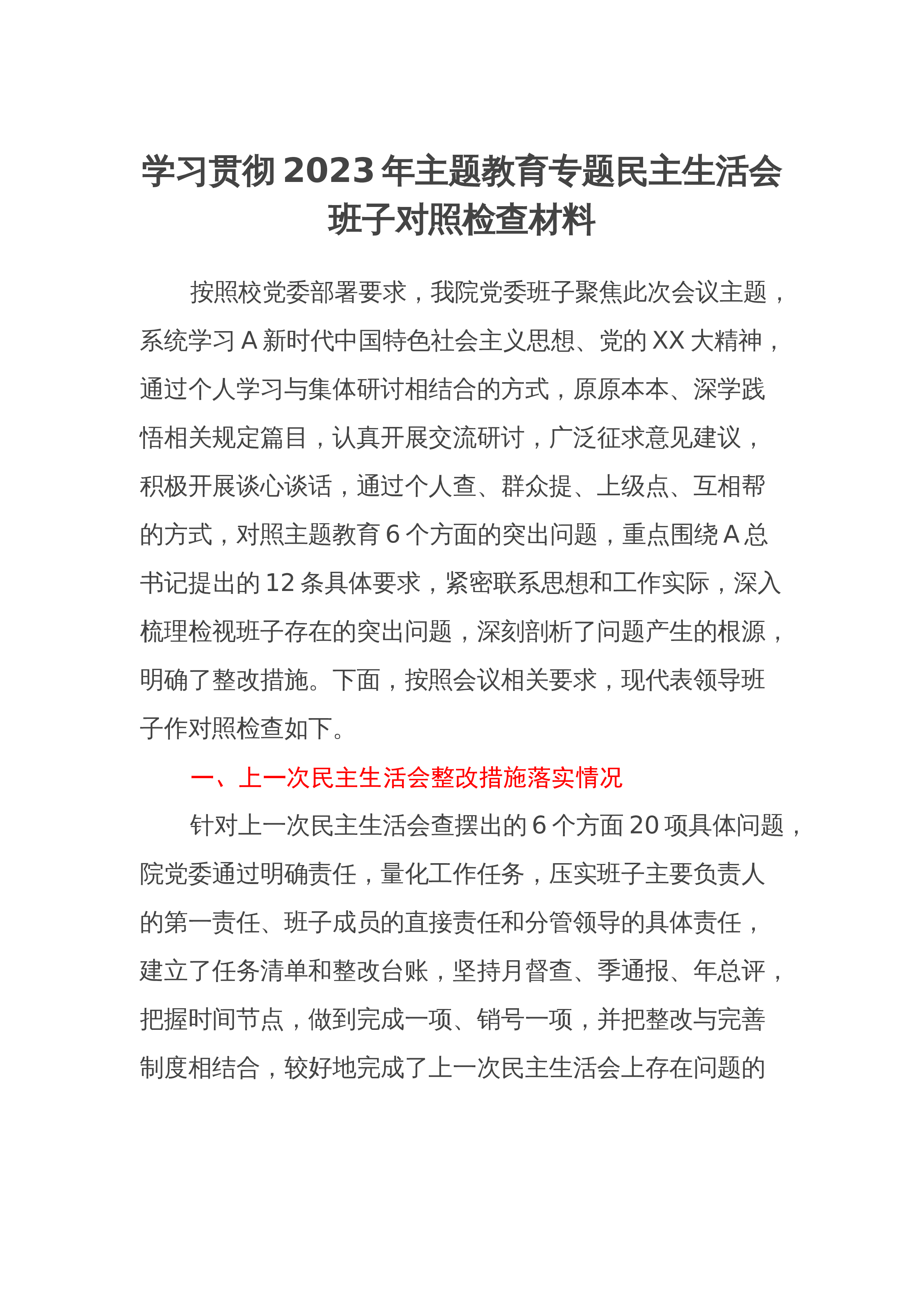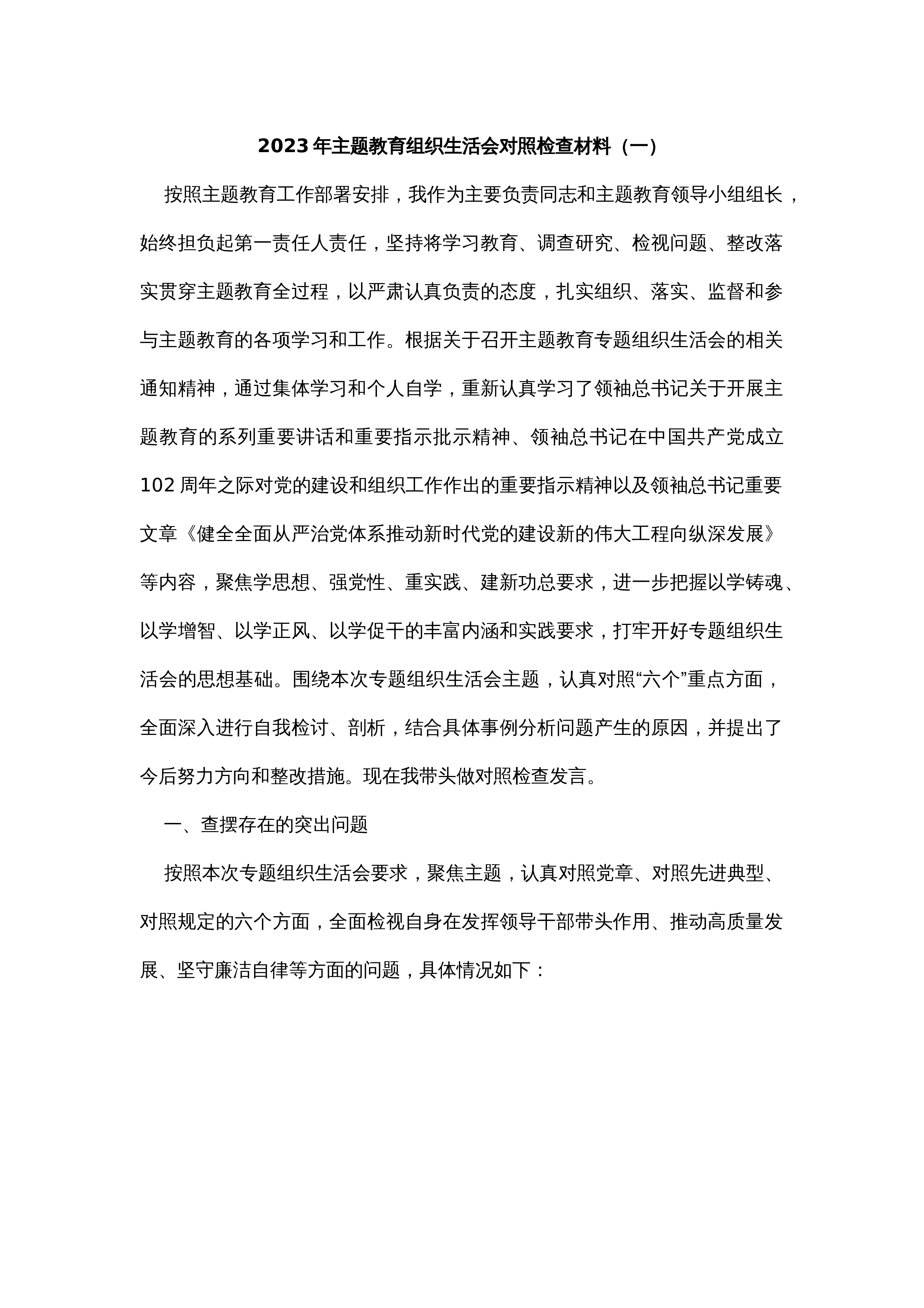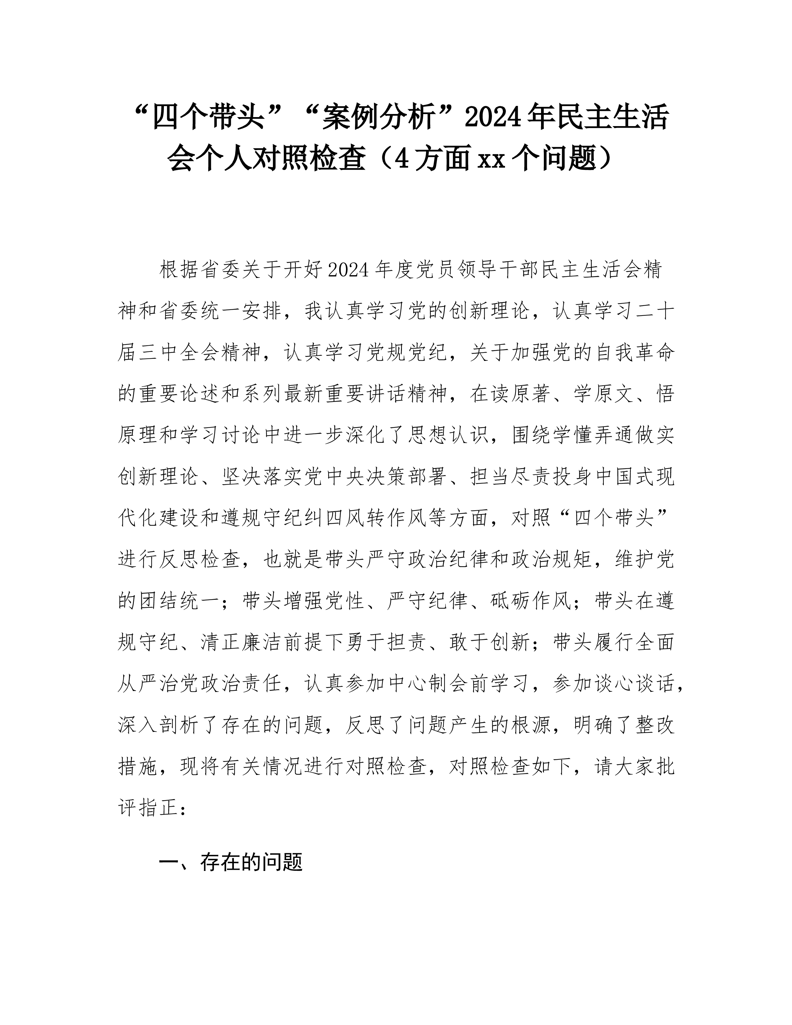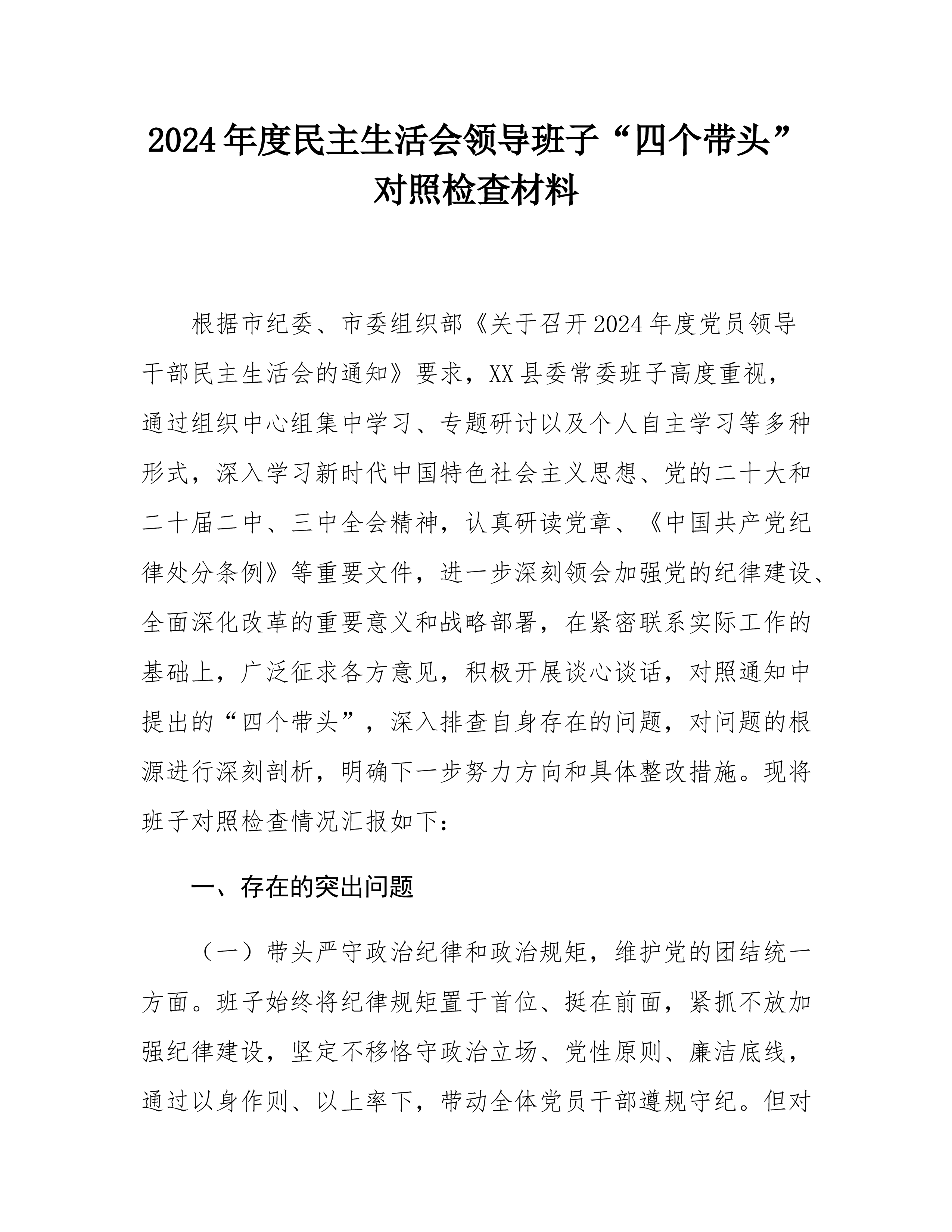 2024年度组织生活会“四个带头”个人对照检查材料根据市纪委、市委组织部关于召开2024年度组织生活会的通知要求,我提前准备,及早介入,深入学习了习近平总书记重要讲话精神,系统研读《中国共产党纪律处分条例》,重温党章党规。我在开展谈心谈话、广泛征求意见的基础上,紧密“结合个人思想工作实际,紧紧围绕带头严守纪律和政治规矩,维护党的团结统一;带头增强党性、严守纪律、砥砺作风方面;带头在遵规守纪、清正廉洁前提下勇于担当、敢于创新;”带头履行全面从严治党政治责任4个方面,深入查找自身存在的问题和不足,全面剖析问题产生的根源,进一步明确了今后的努力方向和整改措施。现作如下对照检查。一、存在的突出问题(一...