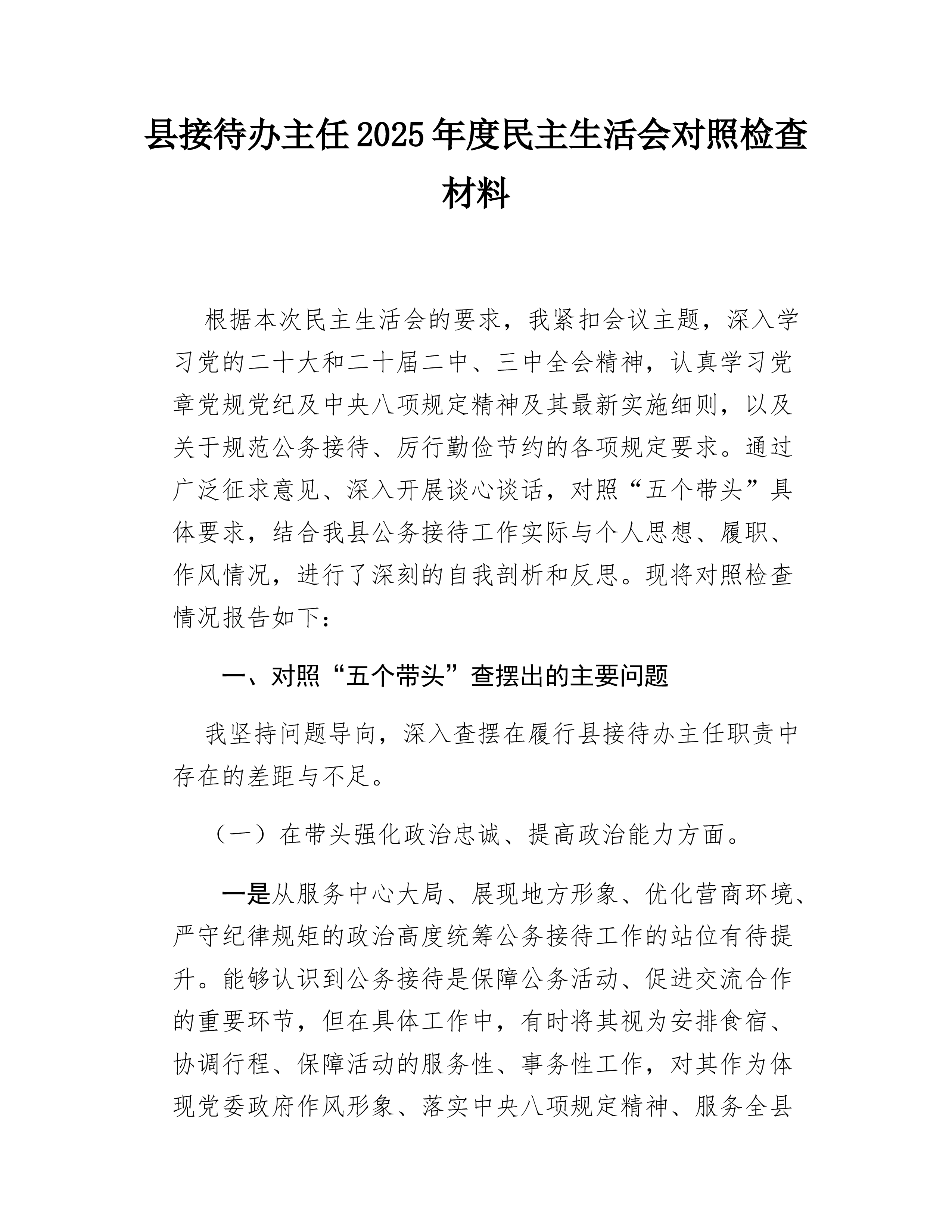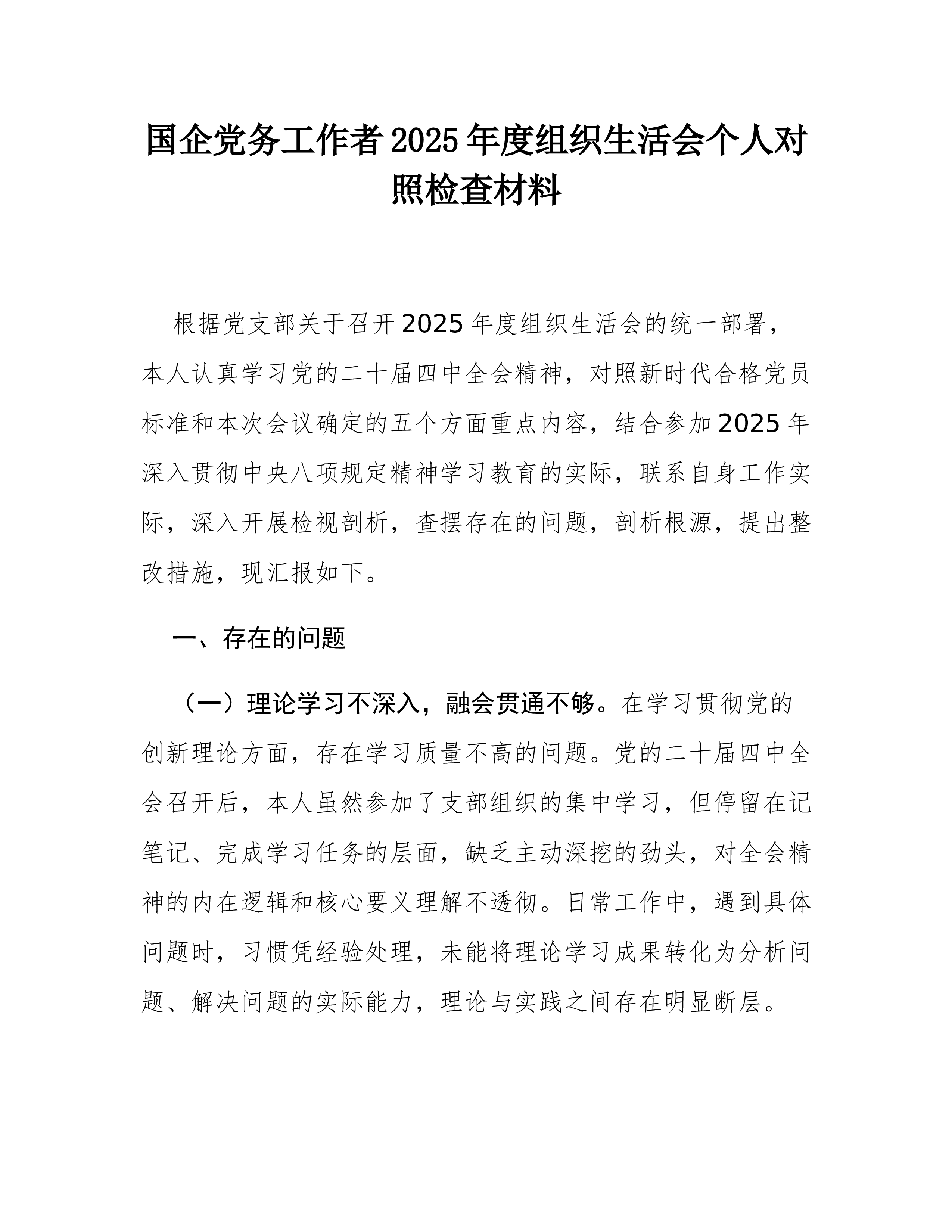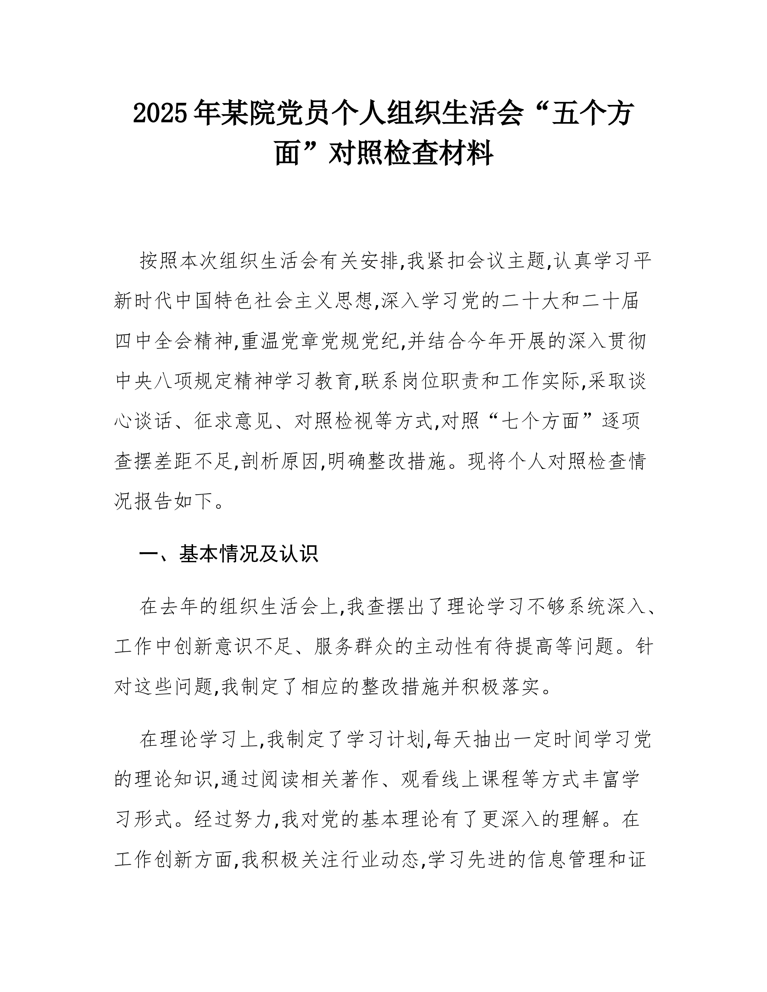 2025年某院党员个人组织生活会“五个方面”对照检查材料按照本次组织生活会有关安排,我紧扣会议主题,认真学习平新时代中国特色社会主义思想,深入学习党的二十大和二十届四中全会精神,重温党章党规党纪,并结合今年开展的深入贯彻中央八项规定精神学习教育,联系岗位职责和工作实际,采取谈心谈话、征求意见、对照检视等方式,对照“七个方面”逐项查摆差距不足,剖析原因,明确整改措施。现将个人对照检查情况报告如下。一、基本情况及认识在去年的组织生活会上,我查摆出了理论学习不够系统深入、工作中创新意识不足、服务群众的主动性有待提高等问题。针对这些问题,我制定了相应的整改措施并积极落实。在理论学习上,我制定了学习计划,每天抽出一定时间学习党的理论知识,通过阅读相关著作、观看线上课程等方式丰富学习形式。经过努力,我对...