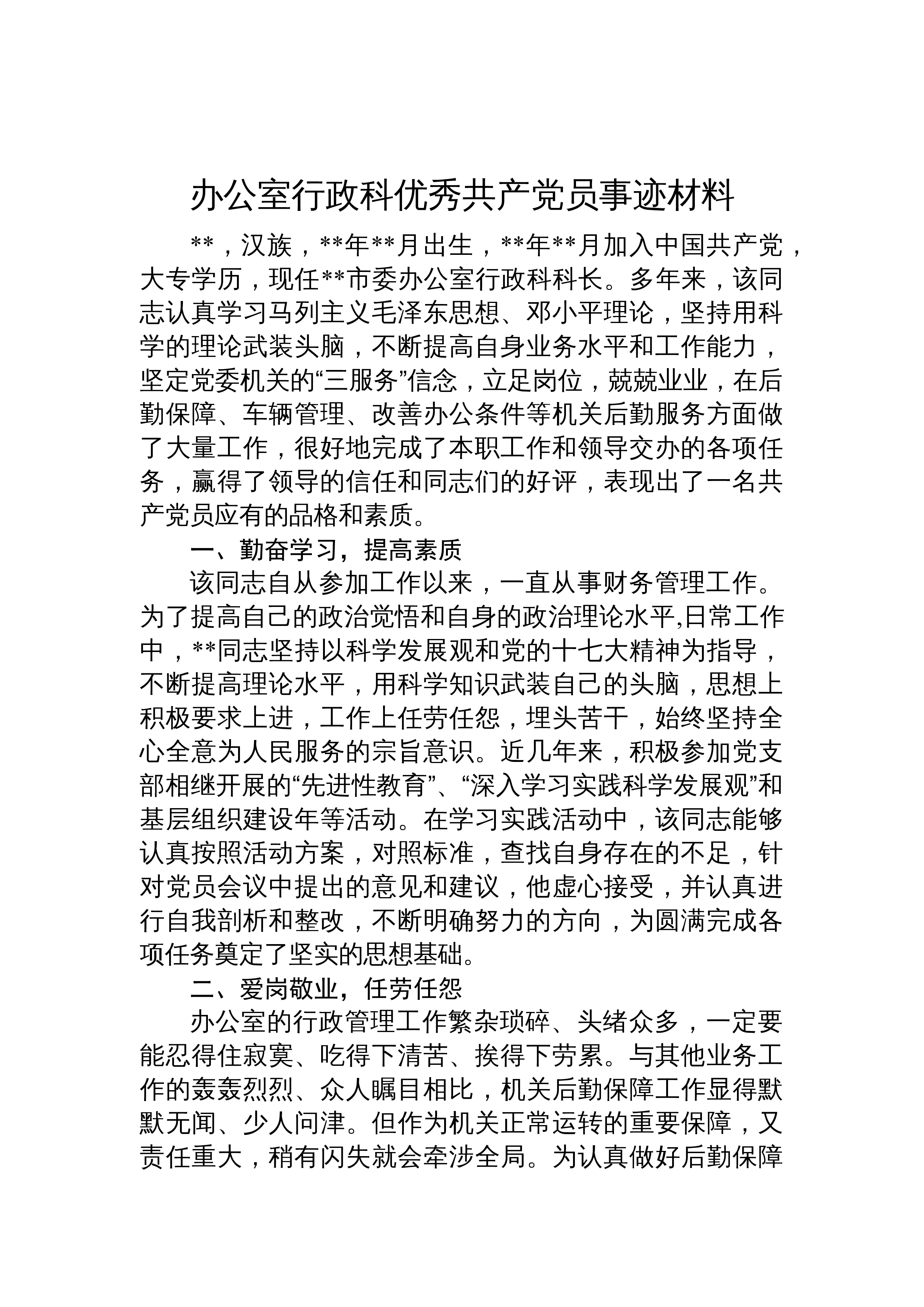 办公室行政科优秀共产党员事迹材料**,汉族,**年**月出生,**年**月加入中国共产党,大专学历,现任**市委办公室行政科科长。多年来,该同志认真学习马列主义毛泽东思想、邓小平理论,坚持用科学的理论武装头脑,不断提高自身业务水平和工作能力,坚定党委机关的“三服务”信念,立足岗位,兢兢业业,在后勤保障、车辆管理、改善办公条件等机关后勤服务方面做了大量工作,很好地完成了本职工作和领导交办的各项任务,赢得了领导的信任和同志们的好评,表现出了一名共产党员应有的品格和素质。一、勤奋学习,提高素质该同志自从参加工作以来,一直从事财务管理工作。为了提高自己的政治觉悟和自身的政治理论水平,日常工作中,**同...