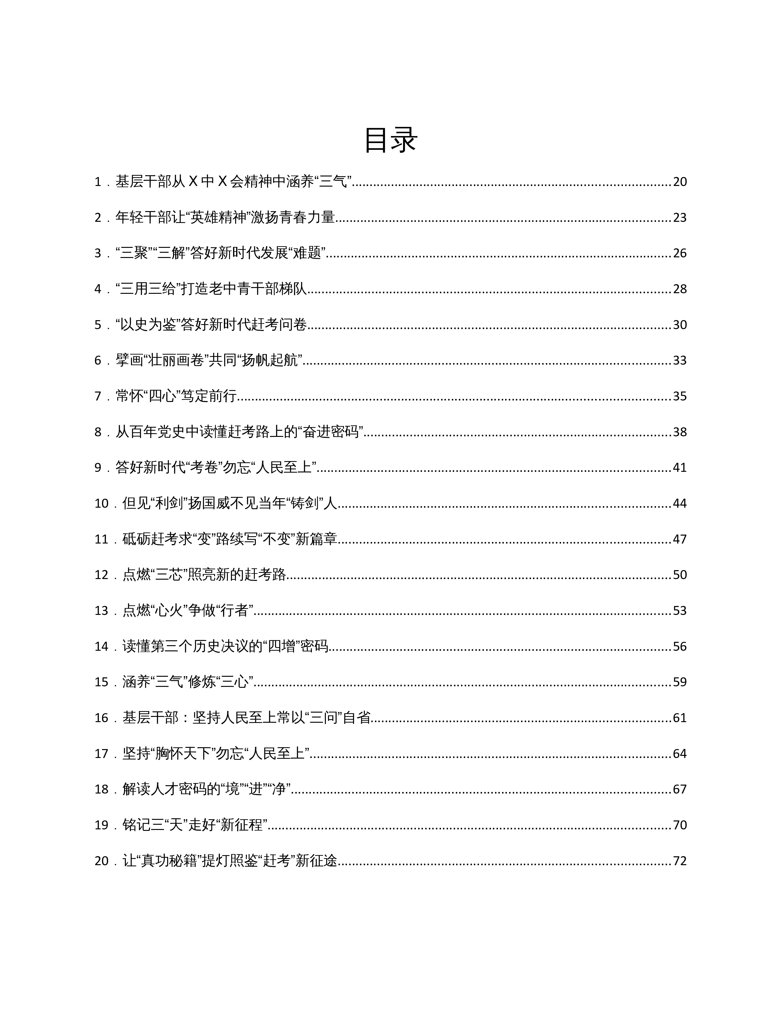 目录1.基层干部从X中X会精神中涵养“三气”.........................................................................................202.年轻干部让“英雄精神”激扬青春力量..............................................................................................233.“三聚”“三解”答好新时代发展“难题”......................................................