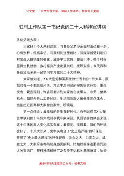 公文堂——公文写作之家、体制人加油站、材料每天更新驻村工作队第一书记党的二十大精神宣讲稿各位父老乡亲:大家好!今天来到这里,与各位父老乡亲面对面坐在一起,心情别样,倍感亲切。与我刚到这里相比,我深深感受到咱们村发生天翻地覆的变化,道路平坦宽阔、整洁干净,整个村落显得生机勃勃,乡村振兴产业发展兴旺。按照安排,今天我和各位父老乡亲一起学习学习党的二十大精神。大家都知道,XX大是党和国家政治生活中的一件大事,跟我们每一个都息息相关。习近平总书记的报告语言朴实、重点突出、观点深刻,许多话都讲到大家的心坎里去。今天,借此机会,我结合自己工作经历、生活阅历跟大家分享三点体会,也是想近距离和大家拉拉家常、唠...