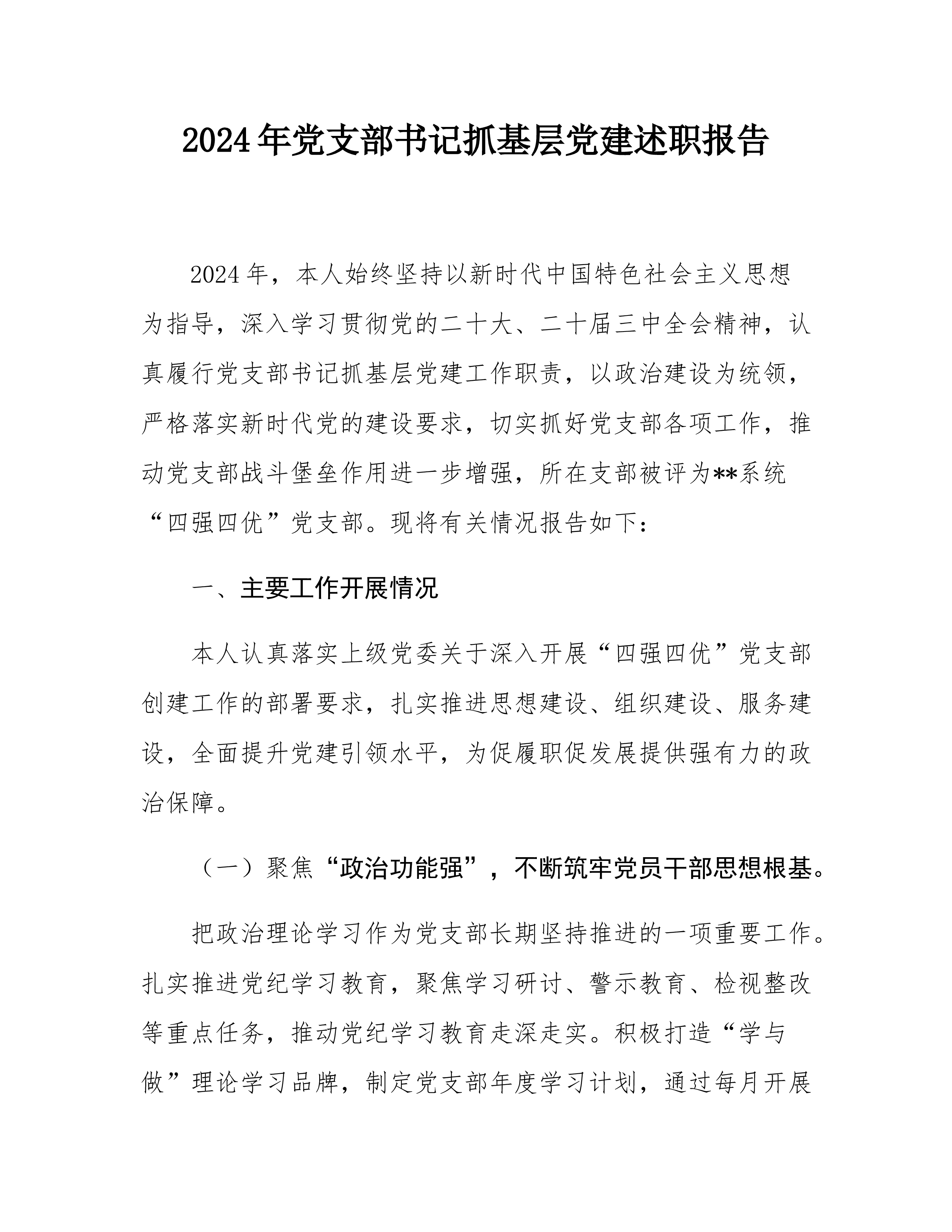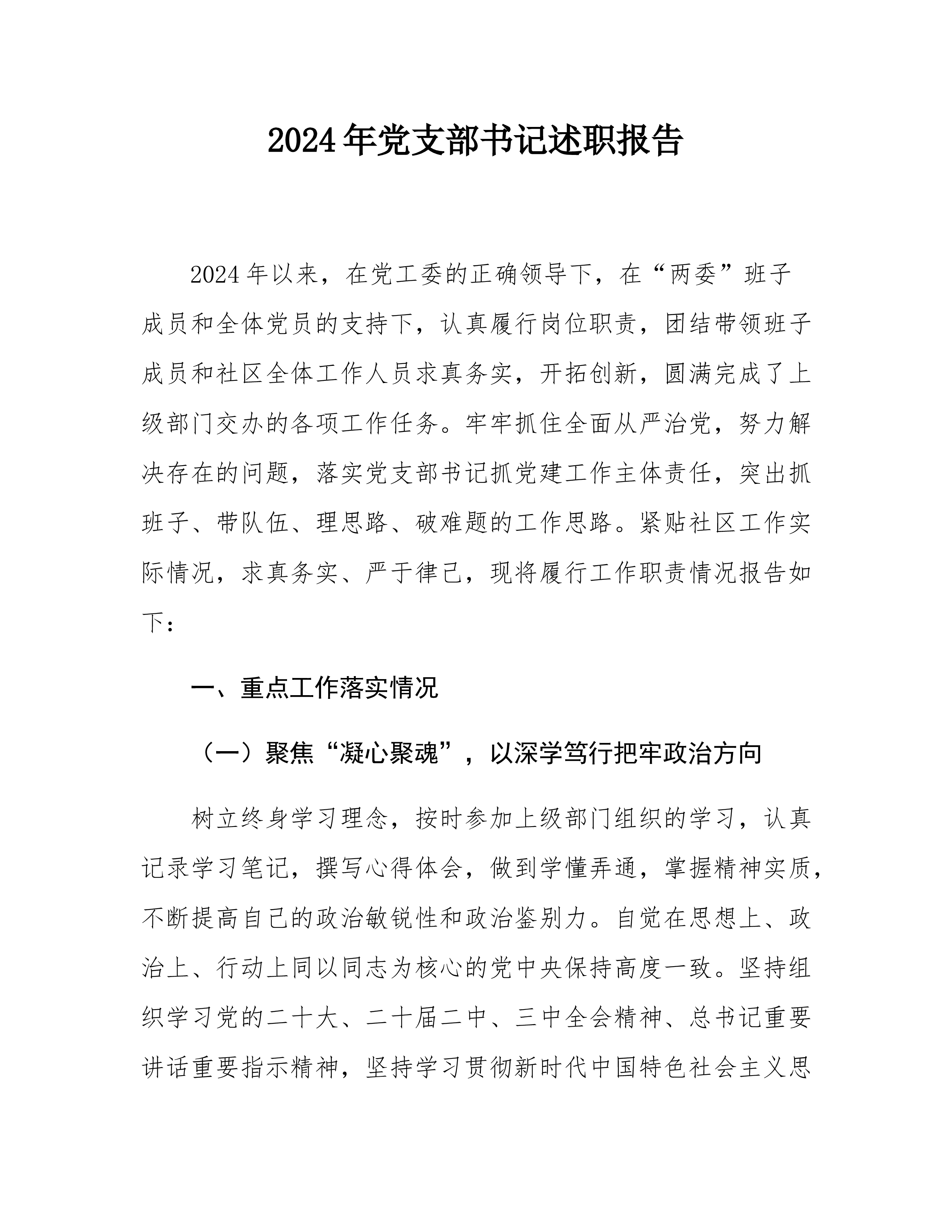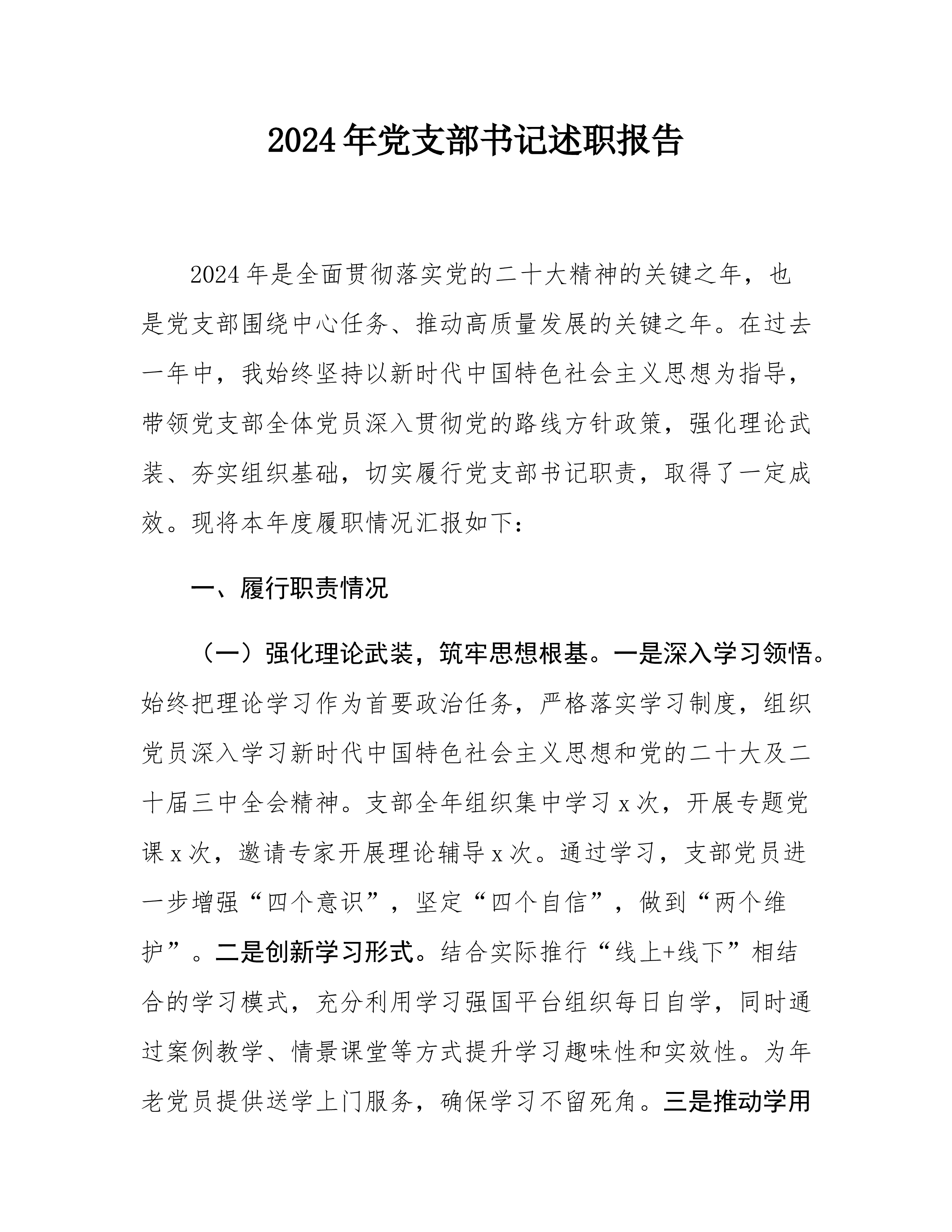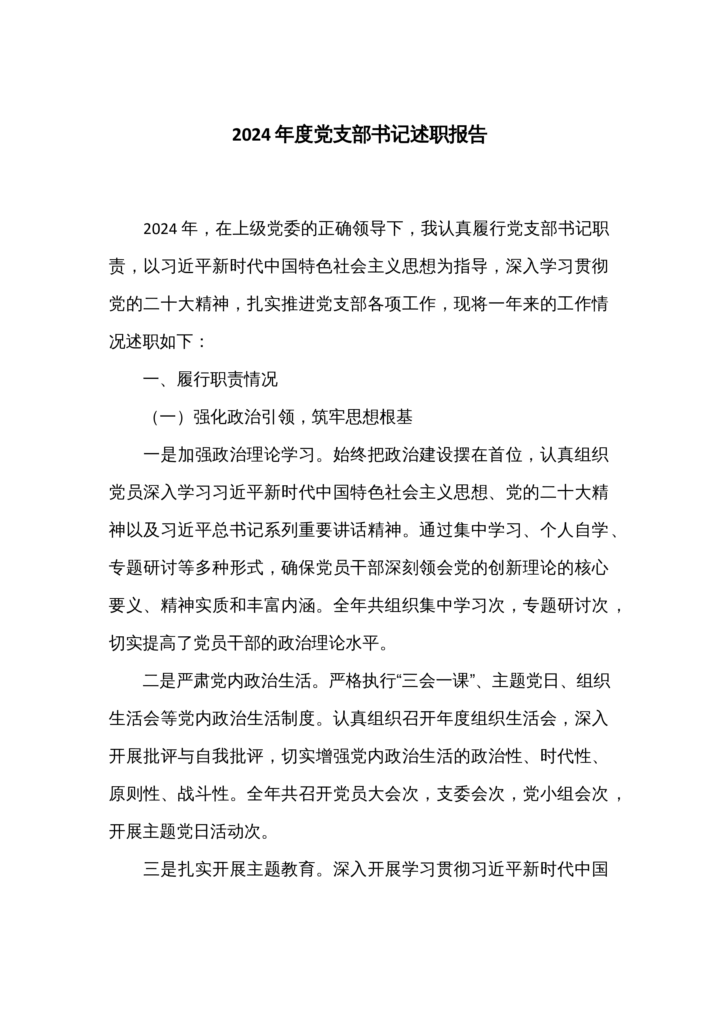 2024年党支部书记述职报告2024年是全面贯彻落实党的二十大精神的关键之年,也是党支部围绕中心任务、推动高质量发展的关键之年。在过去一年中,我始终坚持以新时代中国特色社会主义思想为指导,带领党支部全体党员深入贯彻党的路线方针政策,强化理论武装、夯实组织基础,切实履行党支部书记职责,取得了一定成效。现将本年度履职情况汇报如下:一、履行职责情况(一)强化理论武装,筑牢思想根基。一是深入学习领悟。始终把理论学习作为首要政治任务,严格落实学习制度,组织党员深入学习新时代中国特色社会主义思想和党的二十大及二十届三中全会精神。支部全年组织集中学习x次,开展专题党课x次,邀请专家开展理论辅导x次。通过学习...