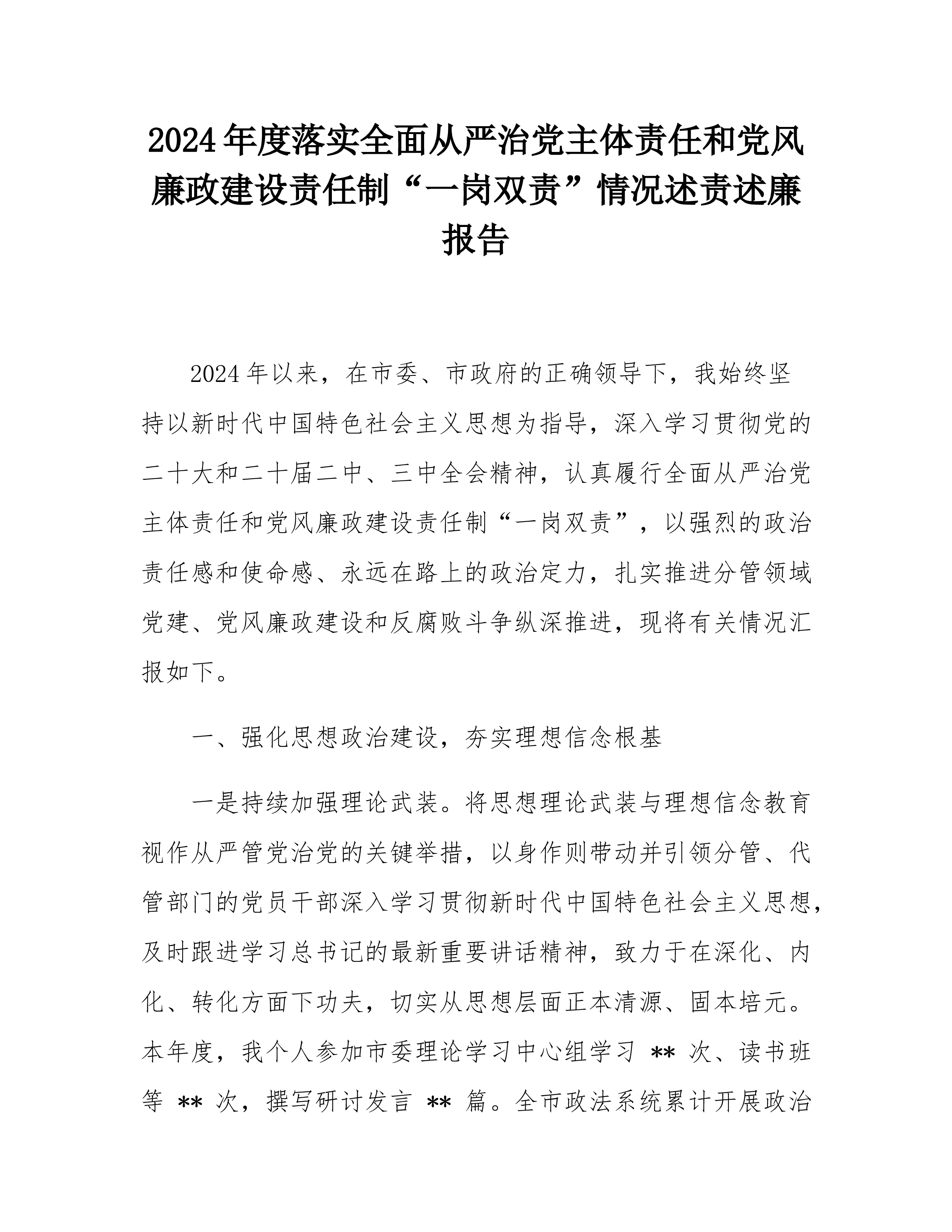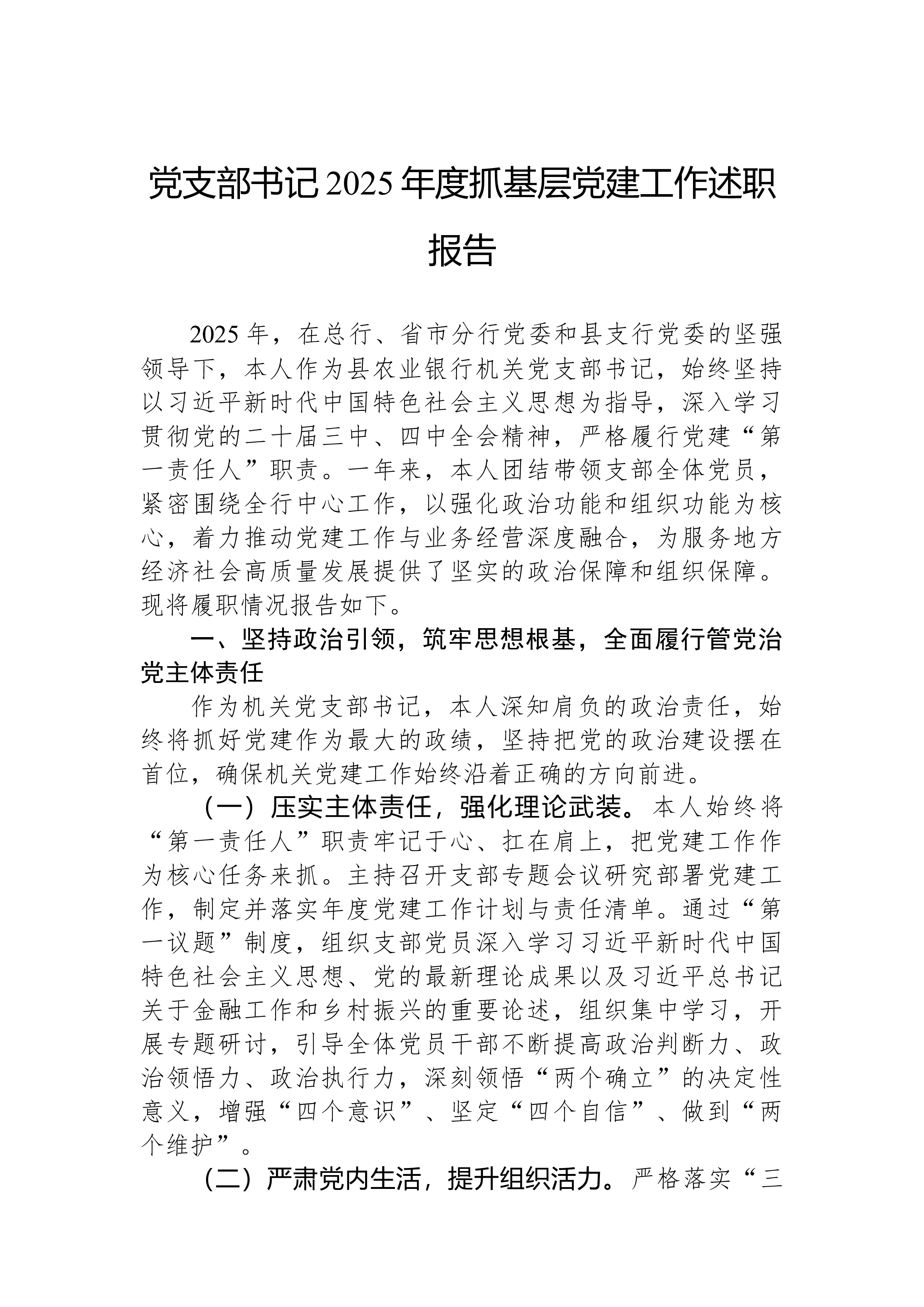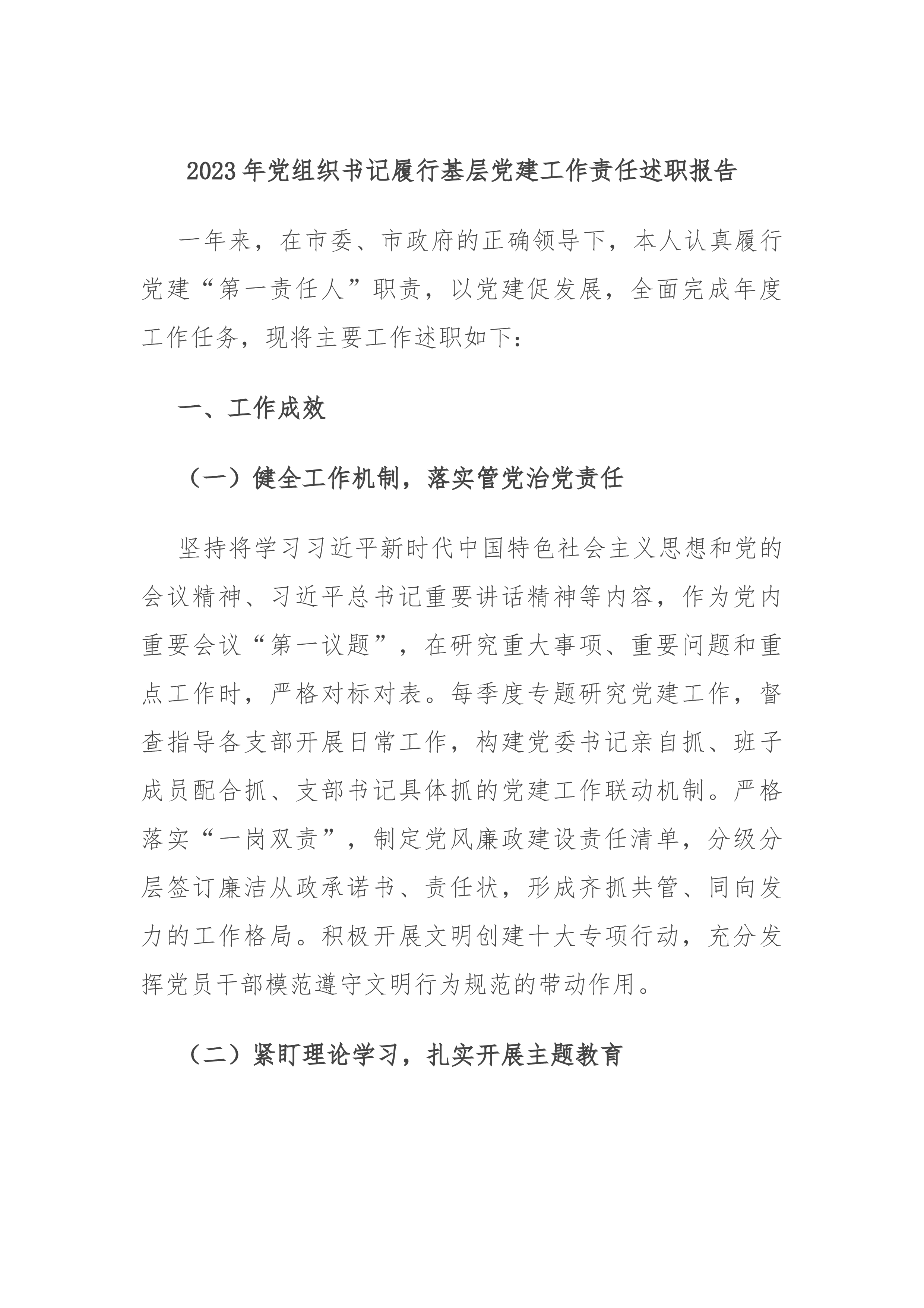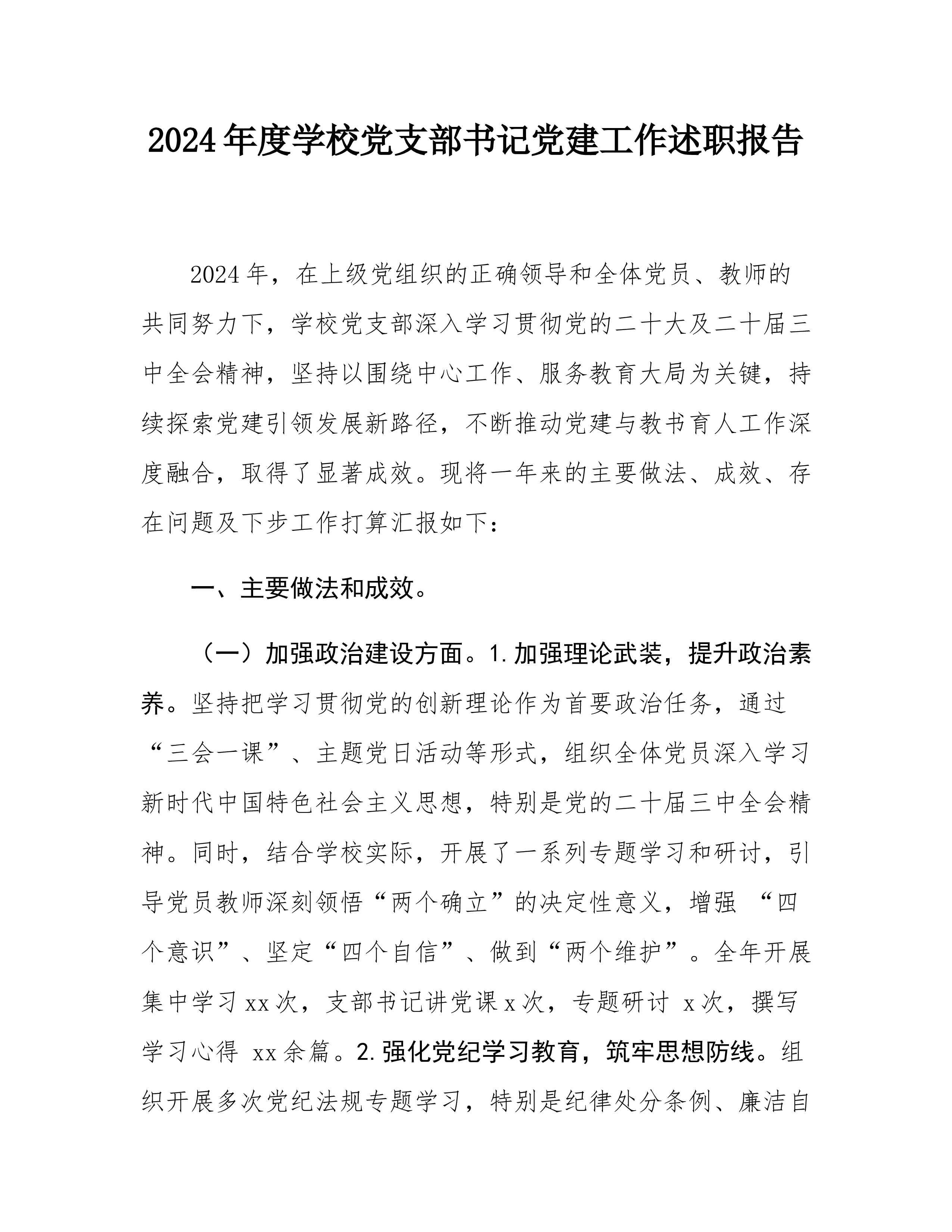 2024年党支部书记述职报告2024年是全面贯彻落实党的二十大精神的关键之年,也是党支部围绕中心任务、推动高质量发展的关键之年。在过去一年中,我始终坚持以新时代中国特色社会主义思想为指导,带领党支部全体党员深入贯彻党的路线方针政策,强化理论武装、夯实组织基础,切实履行党支部书记职责,取得了一定成效。现将本年度履职情况汇报如下:一、履行职责情况(一)强化理论武装,筑牢思想根基。一是深入学习领悟。始终把理论学习作为首要政治任务,严格落实学习制度,组织党员深入学习新时代中国特色社会主义思想和党的二十大及二十届三中全会精神。支部全年组织集中学习x次,开展专题党课x次,邀请专家开展理论辅导x次。通过学习...