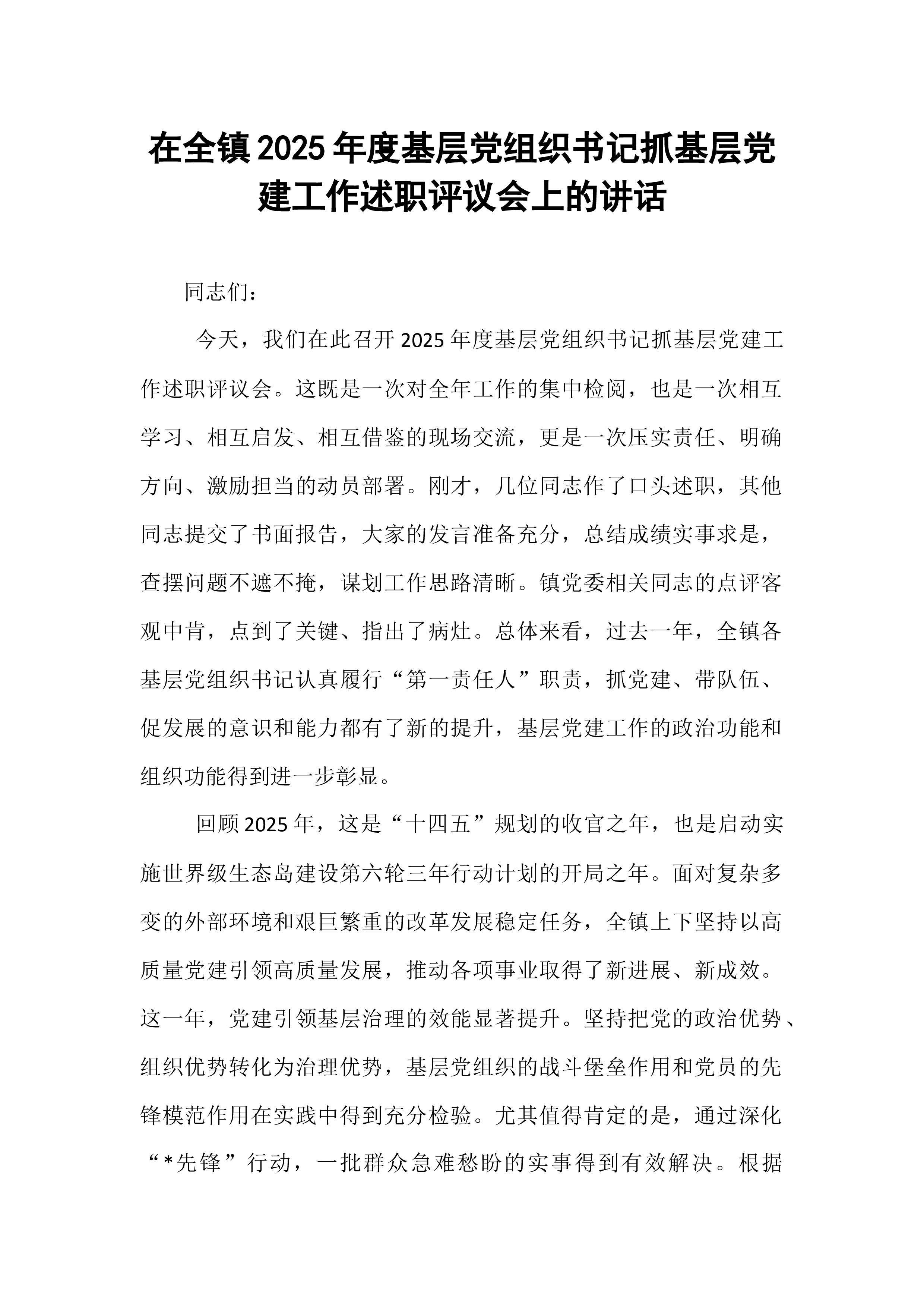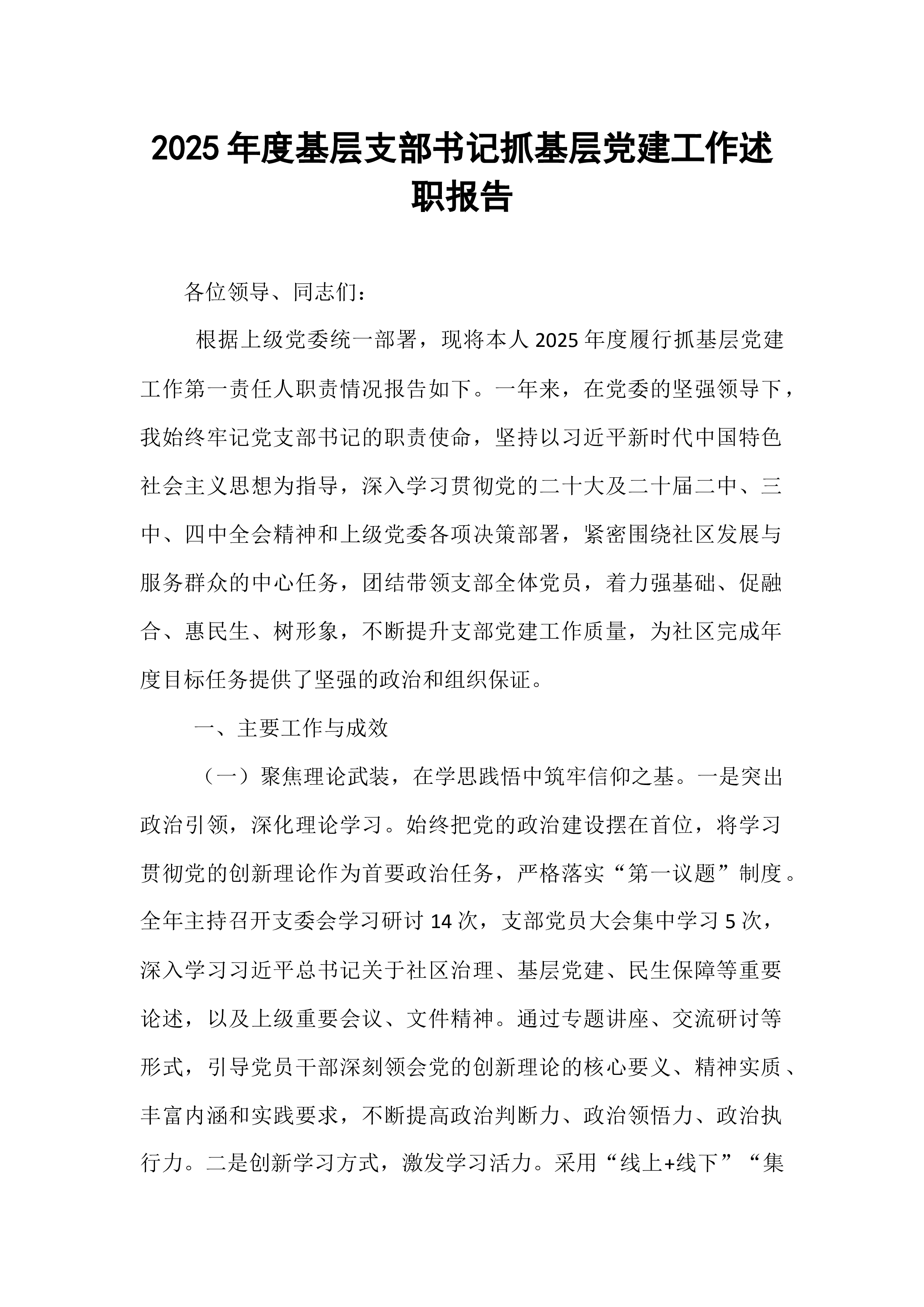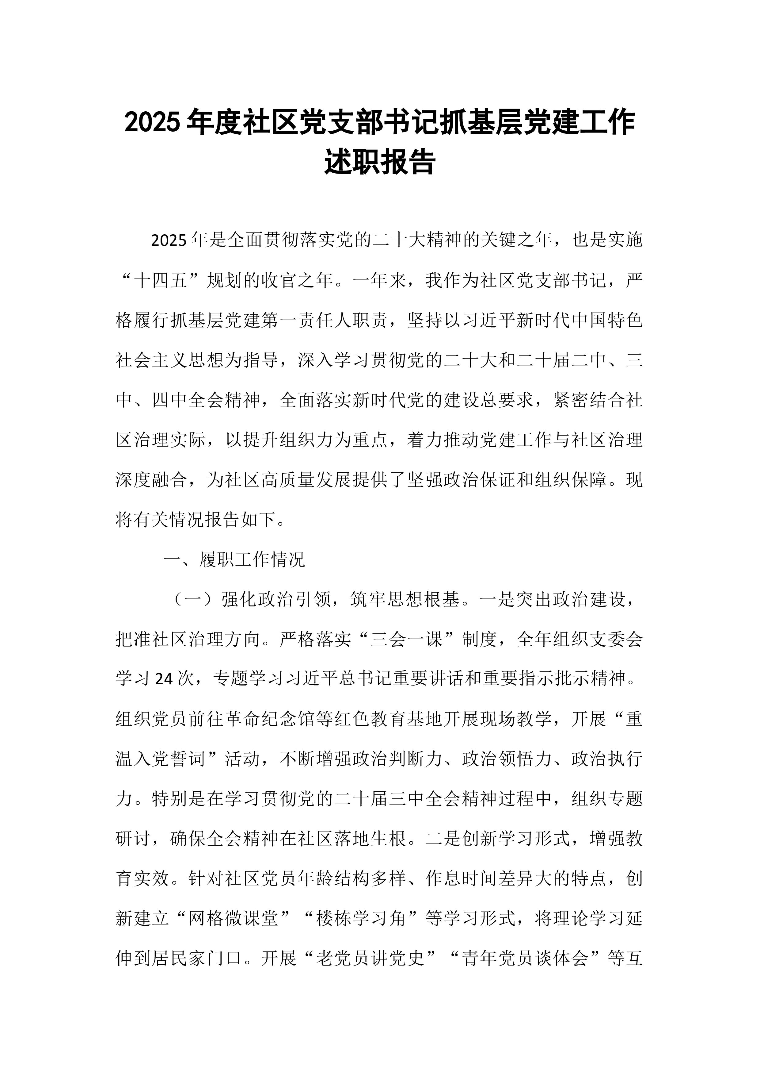 2025年度社区党支部书记抓基层党建工作述职报告2025年是全面贯彻落实党的二十大精神的关键之年,也是实施“十四五”规划的收官之年。一年来,我作为社区党支部书记,严格履行抓基层党建第一责任人职责,坚持以习近平新时代中国特色社会主义思想为指导,深入学习贯彻党的二十大和二十届二中、三中、四中全会精神,全面落实新时代党的建设总要求,紧密结合社区治理实际,以提升组织力为重点,着力推动党建工作与社区治理深度融合,为社区高质量发展提供了坚强政治保证和组织保障。现将有关情况报告如下。一、履职工作情况(一)强化政治引领,筑牢思想根基。一是突出政治建设,把准社区治理方向。严格落实“三会一课”制度,全年组织支委会学习24次,专题学习习近平总书记重要讲话和重要指示批示精神。组织党员前往革命纪念馆等红色教育基地开展...