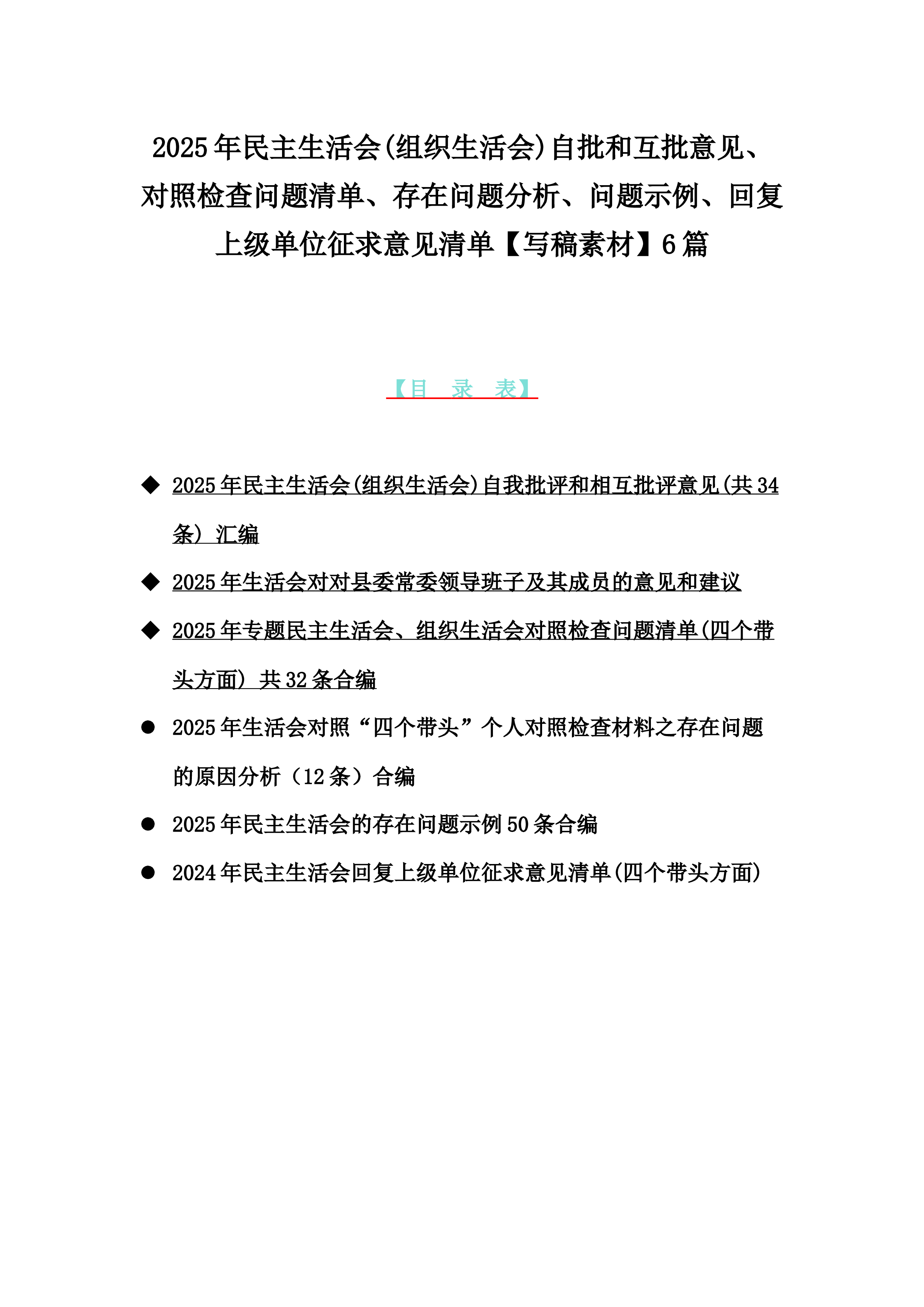 2025年民主生活会(组织生活会)自批和互批意见、对照检查问题清单、存在问题分析、问题示例、回复上级单位征求意见清单【写稿素材】6篇