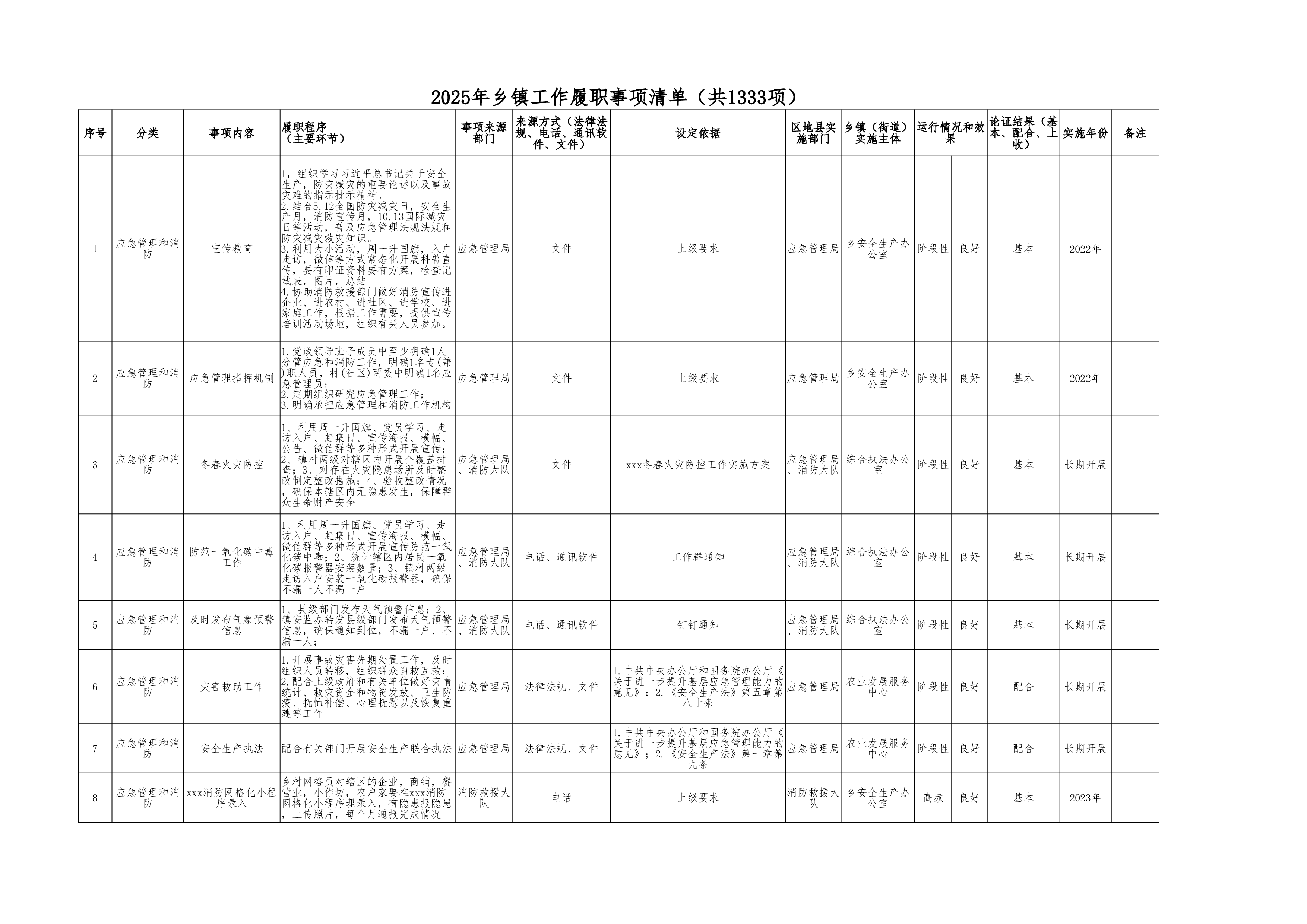 序号分类事项内容设定依据实施年份备注1宣传教育应急管理局文件上级要求应急管理局阶段性良好基本2应急管理指挥机制应急管理局文件上级要求应急管理局阶段性良好基本3冬春火灾防控文件阶段性良好基本长期开展4电话、通讯软件工作群通知阶段性良好基本长期开展5电话、通讯软件钉钉通知阶段性良好基本长期开展6灾害救助工作应急管理局法律法规、文件应急管理局阶段性良好配合长期开展7安全生产执法配合有关部门开展安全生产联合执法应急管理局法律法规、文件应急管理局阶段性良好配合长期开展8电话上级要求高频良好基本2025年乡镇工作履职事项清单(共1333项)履职程序(主要环节)事项来源部门来源方式(法律法规、电话、通讯软件...