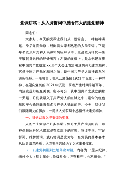 党课讲稿:从入党誓词中感悟伟大的建党精神同志们:大家好,今天的党课让我们从一段誓言、一种精神讲起。身后这面党旗,镌刻着大家都熟悉的入党誓词,它是每名党员对党和人民做出的庄严承诺,更是党员终其一生应该躬身践行的铮铮誓言;左侧的展板上,是总书记在庆祝中国共产党成立xx周年大会上首次阐述的伟大建党精神,它是中国共产党的精神之源,是中国共产党人精神谱系的源头根脉。一段誓言,在风云激荡的1921年诞生;一种精神,在迈向复兴的2021年沉淀,两者产生时间跨越百年,内涵意蕴却相互关联、密不可分,从中国共产党成立的那一天起,它们就融入了共产党人的血脉之中,蕴含的红色基因至今仍鼓舞着每名共产党人砥砺前行。今天,...