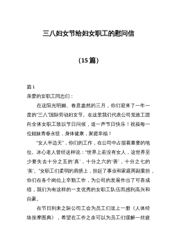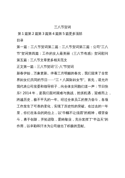 三八节贺词第1篇第2篇第3篇第4篇第5篇更多顶部目录第一篇:三八节贺词第二篇:三八节贺词第三篇:公司“三八节”贺词第四篇:工作的女人最美丽(三八节有感)贺词慰问第五篇:三八节文章更多相关范文正文第一篇:三八节贺词“三·八”节贺词新春伊始,万象更新。伴着三月明媚的春光,我们迎来了全世界妇女们共同的节日——“三〃八国际妇女节”。首先,请允许我代表公司党委和领导班子,向全体女同胞们道一声:节日快乐!2014年,是我们面对困难与挑战,抢抓机遇,迎难而上,跨越历史,极不平凡的一年。经过全体员工的努力奋斗,各项工作发生了可喜的变化,实现了历史性的突破。在过去的一年里,你们在各自的岗位上,以“巾帼不让须眉”...