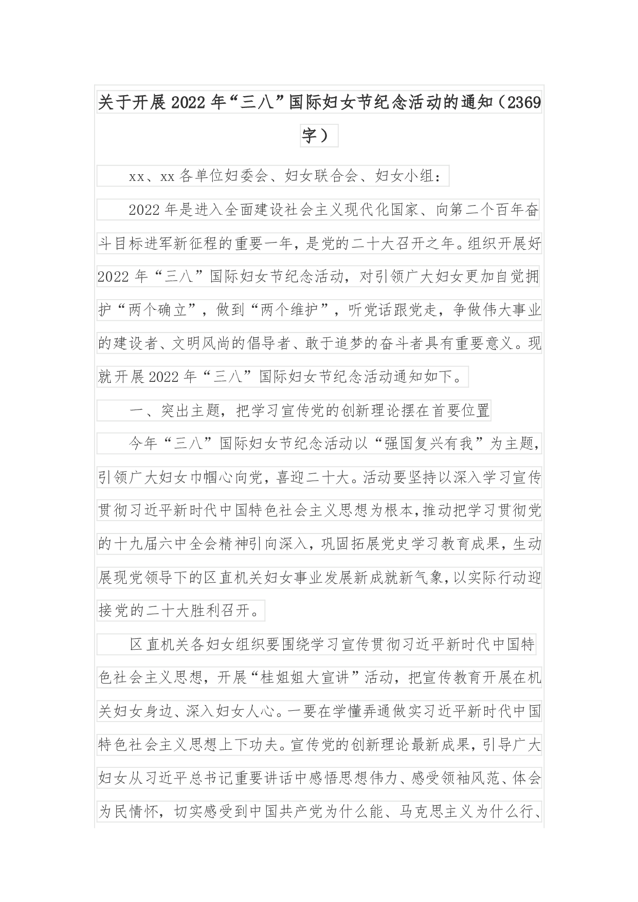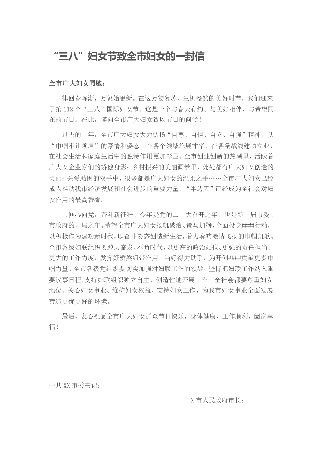 “三八”妇女节致全市妇女的一封信全市广大妇女同胞:律回春晖渐,万象始更新。在这万物复苏、生机盎然的美好时节,我们迎来了第112个“三八”国际妇女节。这是一个与春天有约、与美好相伴、与希望同在的节日。在此,谨向全市广大妇女致以节日的问候!过去的一年,全市广大妇女大力弘扬“自尊、自信、自立、自强”精神,以“巾帼不让须眉”的豪情和姿态,在各个领域施展才华,在各条战线建功立业,在社会生活和家庭生活中的独特作用更加彰显。全市创业创新的热潮里,活跃着广大女企业家们的矫健身影;乡村振兴的美丽画卷里,处处都有广大妇女创造的美丽;关爱助困的双手中,很多都是广大妇女的温柔之手……全市广大妇女已经成为推动我市经济发...