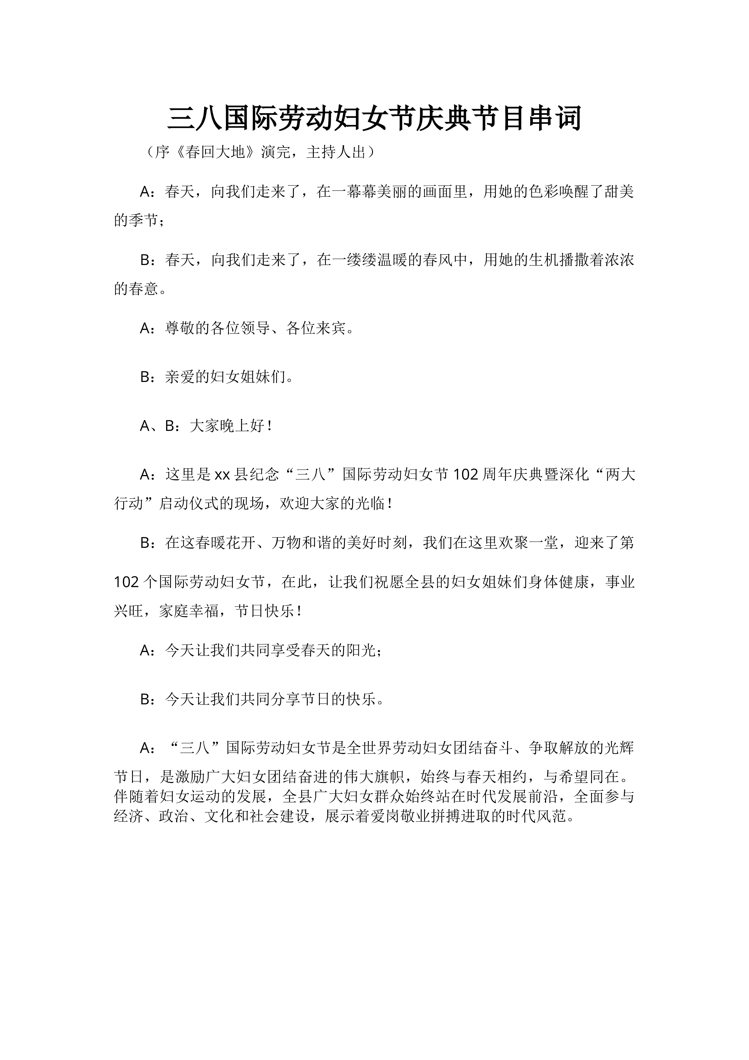 三八节贺词第1篇第2篇第3篇第4篇第5篇更多顶部目录第一篇:三八节贺词第二篇:三八节贺词第三篇:公司“三八节”贺词第四篇:工作的女人最美丽(三八节有感)贺词慰问第五篇:三八节文章更多相关范文正文第一篇:三八节贺词“三·八”节贺词新春伊始,万象更新。伴着三月明媚的春光,我们迎来了全世界妇女们共同的节日——“三〃八国际妇女节”。首先,请允许我代表公司党委和领导班子,向全体女同胞们道一声:节日快乐!2014年,是我们面对困难与挑战,抢抓机遇,迎难而上,跨越历史,极不平凡的一年。经过全体员工的努力奋斗,各项工作发生了可喜的变化,实现了历史性的突破。在过去的一年里,你们在各自的岗位上,以“巾帼不让须眉”...