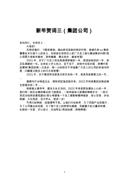 新年贺词三(集团公司)各位同仁、全体员工:大家好!风雨送春归,飞雪迎春到。值此辞旧迎新的美好时刻,我谨代表xx集团董事会并以我个人的名义,向奋战在各岗位上的广大员工致以最诚挚的问候!衷心祝愿大家新年愉快,身体健康,事业进步,阖家幸福!2021年,对于广大员工来说是值得骄的一年,是团结奋进的一年,是无私奉献的一年。全体员工齐心协力、苦干实干,进取中实现价值,拼搏中更显精神!集团的每一次进步、每一分收获无不洋溢着广大员工对公司的忠诚与热爱,闪耀着元数员工的汗水和智慧!2021年,对于集团来说更是日新月异的一年,是具有战略意义的一年……激情与汗水铸造过去,理性和坚强成就未来。2022年将是集团发展战...