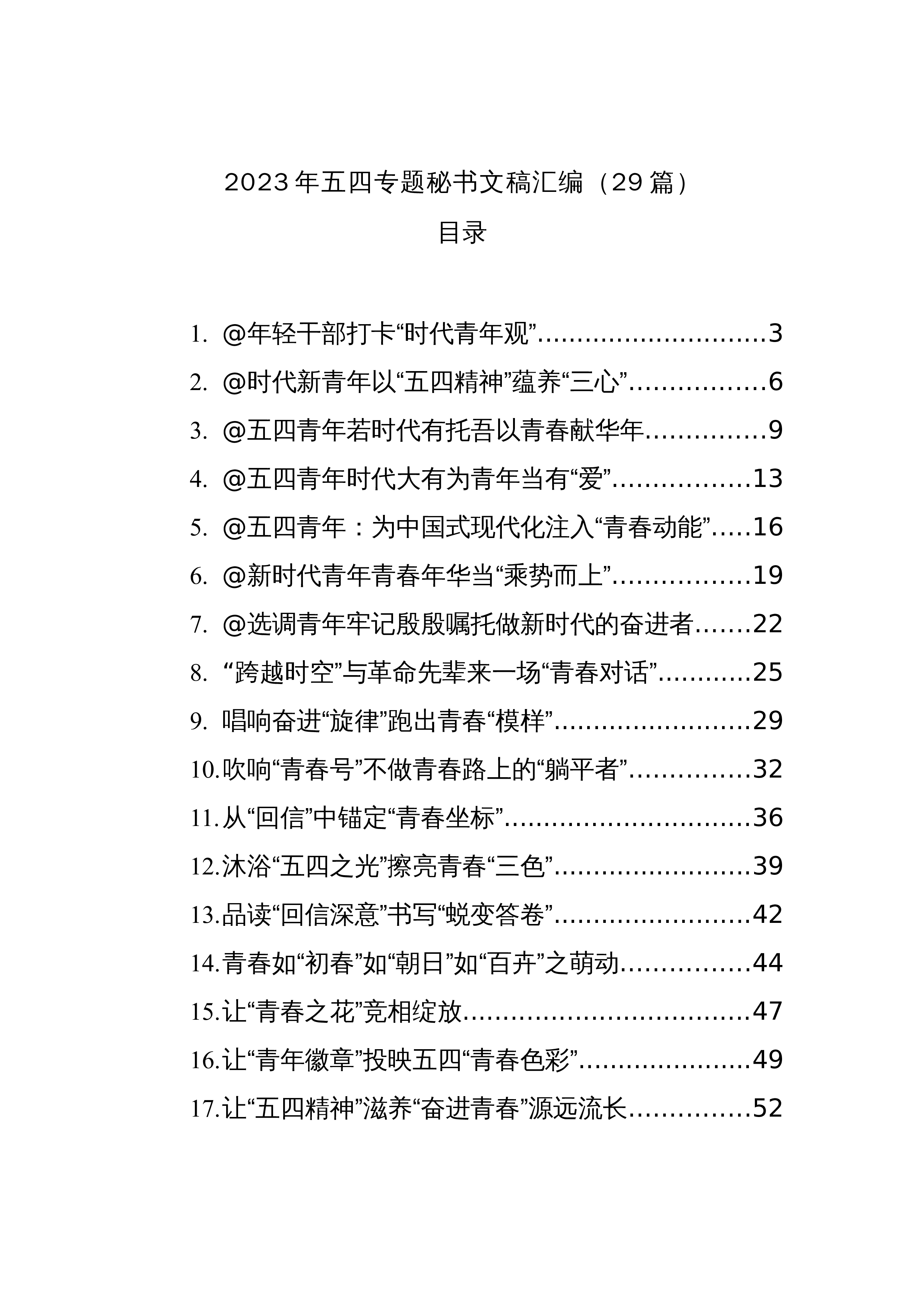 2023年五四专题秘书文稿汇编(29篇)目录1.@年轻干部打卡“时代青年观”.............................32.@时代新青年以“五四精神”蕴养“三心”.................63.@五四青年若时代有托吾以青春献华年...............94.@五四青年时代大有为青年当有“爱”.................135.@五四青年:为中国式现代化注入“青春动能”.....166.@新时代青年青春年华当“乘势而上”.................197.@选调青年牢记殷殷嘱托做新时代的奋进者.......228.“跨越时空”与革命先辈来一场“青春对话”...