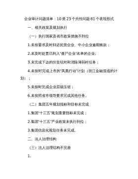 企业审计问题清单:10类23个共性问题81个表现形式一、相关政策及规划执行(一)执行国家及省市政策措施不到位1.未按要求及时归还民营企业、中小企业逾期账款;2.未及时处置已列入“僵尸企业”名单的企业;3.未完成下达的扶贫结对和消除薄弱村任务;4.未按时完成上市的“凤凰行动”计划(浙江金融强省的计划);5.未按时完成企业层级压缩;6.未按照省市领导要求完成其他任务。(二)集团五年规划指标和目标未完成1.集团“十三五”规划重要指标未完成;2.集团“十三五”产业政策未执行到位;3.集团信息化规划任务未完成。二、法人治理结构(三)法人治理结构不完善1.监事会设立及履职不到位,无职工代表,或虽有职工代表...
