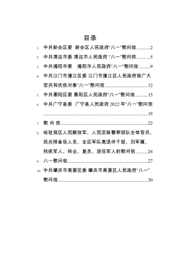 目录1.中共新会区委新会区人民政府“八一”慰问信...........22.中共清远市委清远市人民政府“八一”慰问信...........53.中共揭阳市委 揭阳市人民政府“八一”慰问信.........94.中共江门市蓬江区委江门市蓬江区人民政府致广大官兵和优抚对象“八一”慰问信...................................125.中共惠阳区委惠阳区人民政府“八一”慰问信..........156.中共广宁县委广宁县人民政府2022年“八一”慰问信................................................................