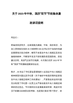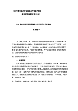 2023年中秋国庆节期间安全大检查大整治工作实施方案范文(三篇)20xx年中秋国庆期间全镇安全生产防范大检查工作方案篇一为认真贯彻全国、省、市安全生产和消防工作暨第三季度防范重特大生产安全事故电视电话会议精神,落实县委县政府有关安全生产工作部署,推动落实国务院安委会安全生产十五条和x“”条硬措施,切实加强中秋国庆重要节假日安全生产防范工作,严防各类事故发生,为中秋国庆假期创造安全稳定环境,决定近期全面开展一次安全生产防范大检查,现制定工作方案如下:一、总体要求认真贯彻落实领袖总书记对安全生产工作的重要指示精神,深刻吸取近期一些地区和行业领域发生的事故教训,切实增强政治敏锐性,更加突出重点地区和...