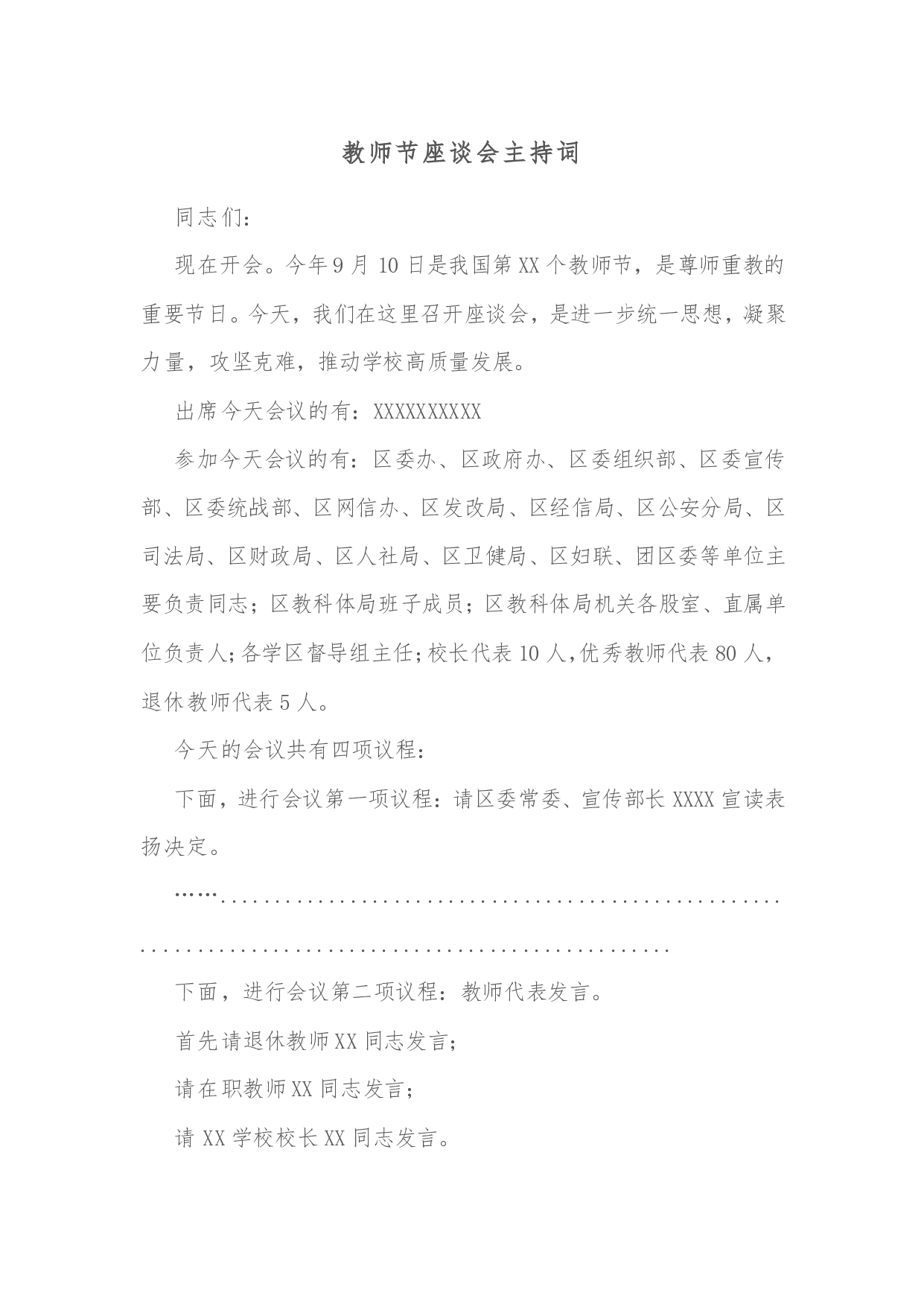 2021年度全县教育大会暨第37个教师节庆祝大会主持词尊敬的各位老师,同志们:大家上午好!今天,我们隆重召开2021年度全县教育工作会议暨第37个教师节庆祝大会,主要目的是总结成绩、表扬先进,在全社会进一步营造尊师重教的浓厚氛围,推动全县教育事业高质量发展,努力办好人民满意的教育。在此,我谨代表县委、县政府,向全县广大教师和教育工作者,致以节日的问候和崇高的敬意!参加会议的有:县委、县人大、县政府、县政协四大班子有关领导同志,县委教育工作领导小组成员单位主要负责同志,各乡镇党委主要负责同志,部分受表扬的先进单位及个人,各乡镇教办主任,县直学校和各乡镇中学学校校长。今天的会议共有6项议程:首先,...